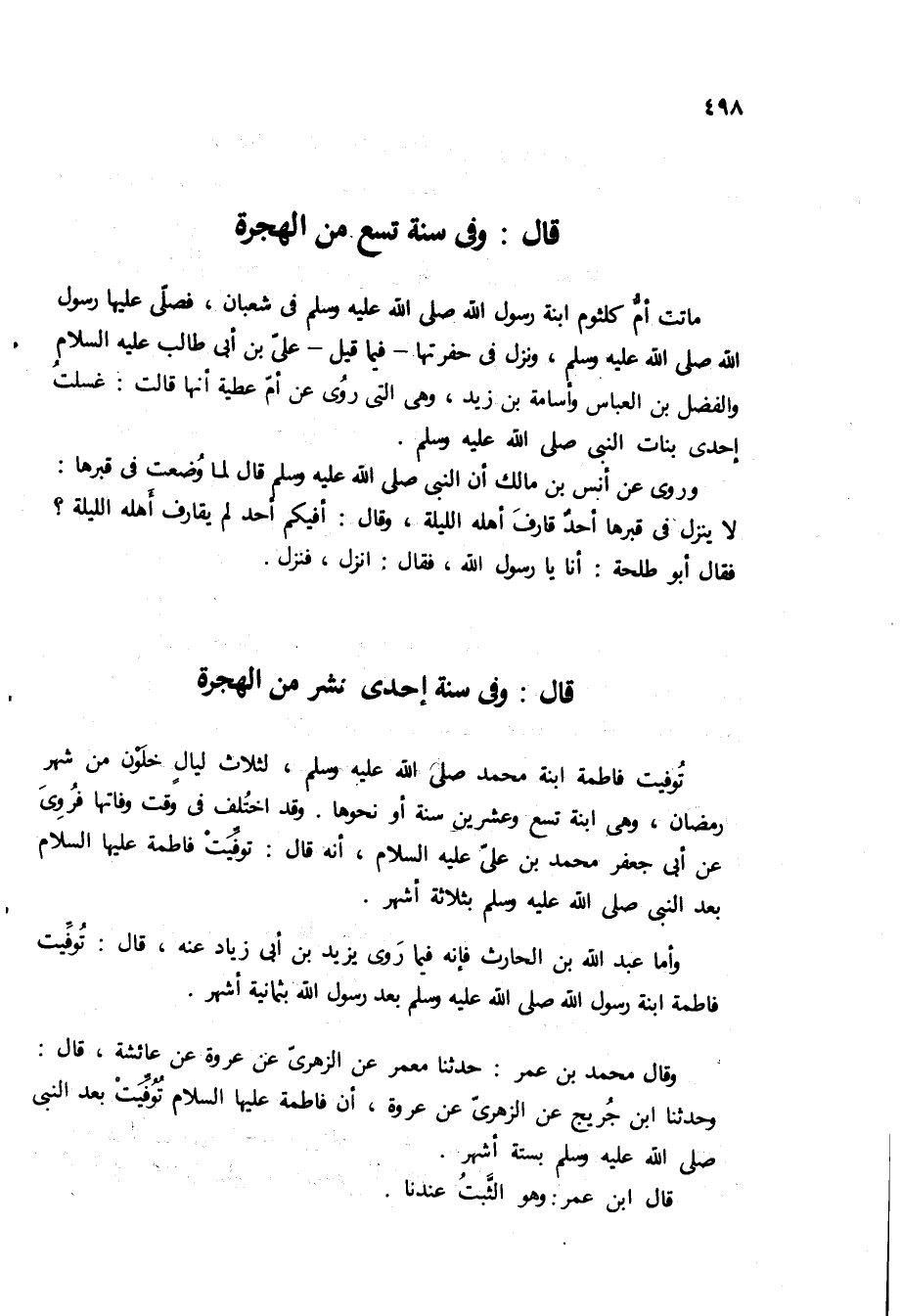 وحدثنا ابن جريج عن الزهري عن عروه، ان فاطمه عليها السلام توفيت بعد النبي ص بسته اشهر.