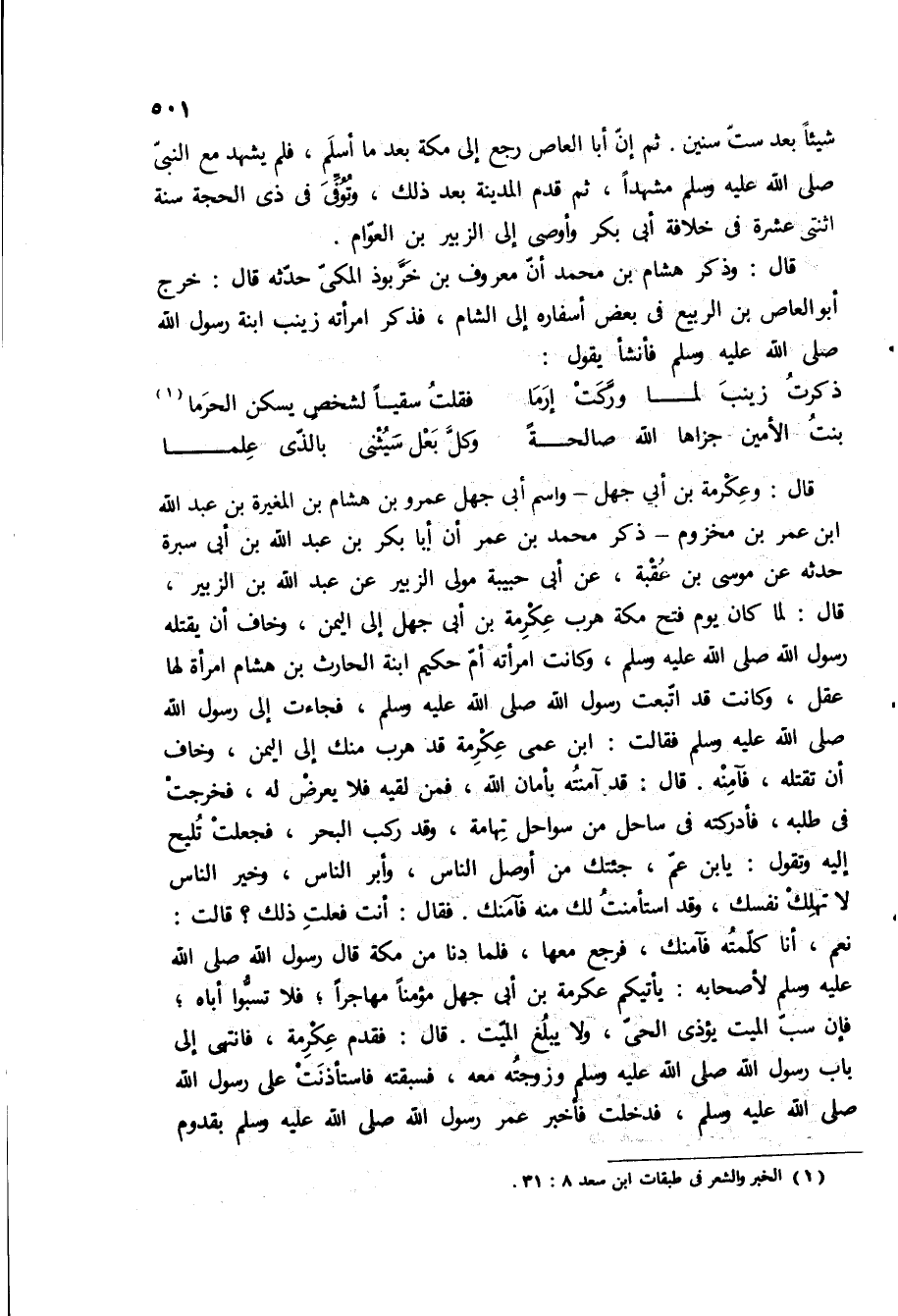 قال: وعكرمه بن ابى جهل- واسم ابى جهل عمرو بْن هشام بْن المغيرة بْن عبد اللَّه ابن عمر بن مخزوم- ذكر محمد بن عمر ان أبا بكر بْن عبد الله بْن أبي سبرة حدثه عَنْ مُوسَى بْنِ عُقْبَةَ، عَنْ أَبِي حَبِيبَةَ مولى الزبير عن عبد الله بن الزبير، قال: لما كان يوم فتح مكة هرب عكرمه بن ابى جهل الى اليمن، وخاف ان يقتله رسول الله ص، وكانت امراته أم حكيم ابنه الحارث بن هشام امراه لها عقل، وكانت قد اتبعت رسول الله ص، فجاءت الى رسول الله ص فقالت: ابن عمى عكرمه قد هرب منك الى اليمن، وخاف ان تقتله، فآمنه قال: قد آمنته بأمان الله، فمن لقيه فلا يعرض له، فخرجت في طلبه، فأدركته في ساحل من سواحل تهامه، وقد ركب البحر، فجعلت تليح اليه وتقول: يا بن عم، جئتك من اوصل الناس، وابر الناس، وخير الناس لا تهلك نفسك، وقد استامنت لك منه فامنك فقال: أنت فعلت ذلك؟ قالت: