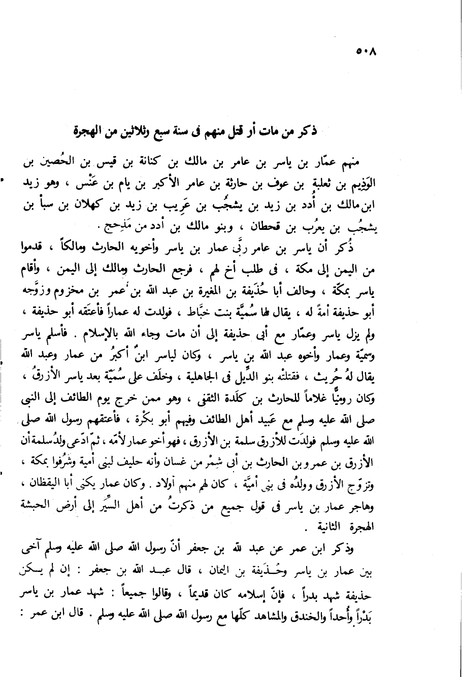 وذكر ابن عمر عن عبد الله بن جعفر ان رسول الله ص آخى بين عمار بن ياسر وحذيفة بن اليمان، قال عبد الله بن جعفر: ان لم يكن حذيفة شهد بدرا، فان اسلامه كان قديما، وقالوا جميعا: شهد عمار بن ياسر بدرا وأحدا والخندق والمشاهد كلها مع رسول الله ص قال ابن عمر: