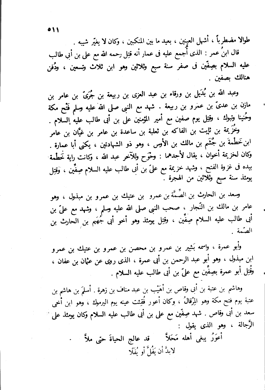 قال ابن عمر: الذى اجمع عليه في عمار انه قتل رحمه الله مع على بن ابى طالب ع بصفين في صفر سنه سبع وثلاثين وهو ابن ثلاث وتسعين، ودفن هنالك بصفين.