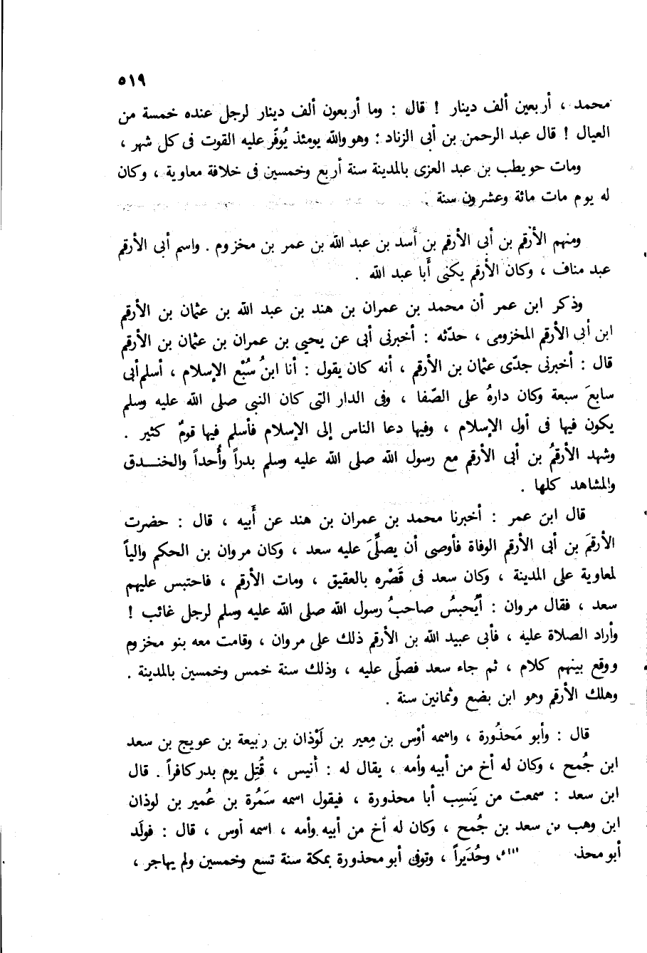محمد، اربعين الف دينار! قال: وما اربعون الف دينار لرجل عنده خمسه من العيال! قال عبد الرحمن بن ابى الزناد: وهو والله يومئذ يوفر عليه القوت في كل شهر، ومات حويطب بن عبد العزى بالمدينة سنه اربع وخمسين في خلافه معاويه، وكان له يوم مات مائه وعشرون سنه ومنهم الارقم بن ابى الارقم بن اسد بْن عبد الله بْن عمر بْن مخزوم واسم ابى الارقم عبد مناف، وكان الارقم يكنى أبا عبد الله.