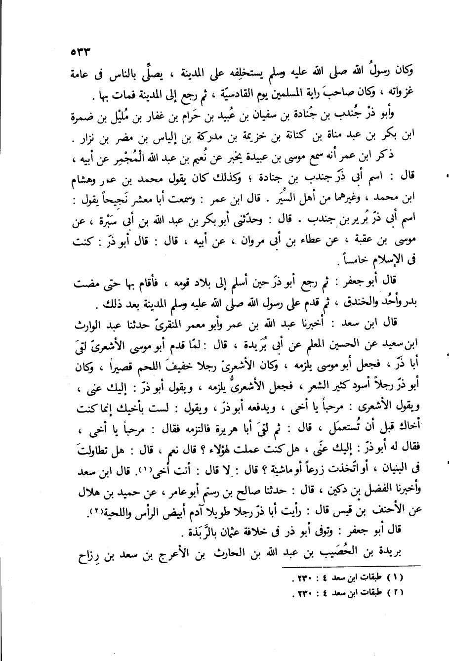 اسم ابى ذر برير بن جندب، قال: وحدثنى أبو بكر بْن عبد الله بْن أبي سبرة، عن موسى بن عقبه، عن عطاء بن ابى مروان، عن ابيه، قال: قال ابو ذر: كنت في الاسلام خامسا قال ابو جعفر: ثم رجع ابو ذر حين اسلم الى بلاد قومه، فأقام بها حتى مضت بدر واحد والخندق، ثم قَدِمَ عَلَى رَسُولِ اللَّهِ صَلَّى اللَّهُ عَلَيْهِ وَسَلَّمَ المدينة بعد ذلك.