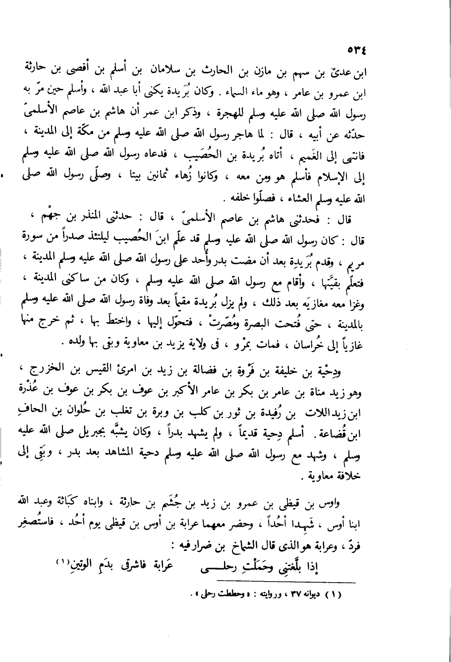 قال: فحدثني هاشم بن عاصم الأسلمي، قال: حدثنى المنذر بن جهم، قَالَ: كَانَ رَسُولُ اللَّهِ صَلَّى اللَّهُ عَلَيْهِ وسلم قد علم ابن الحصيب ليلتئذ صدرا من سوره مريم، وقدم بريده بعد ان مضت بدر واحد عَلَى رَسُول اللَّهِ صلى اللَّه عَلَيْهِ وَسَلَّمَ المدينة، فتعلم بقيتها، واقام مع رسول الله صَلَّى اللَّهُ عَلَيْهِ وَسَلَّمَ، وكان من ساكنى المدينة، وغزا معه مغازيه بعد ذلك، ولم يزل بريده مقيما بعد وفاة رسول الله صَلَّى اللَّهُ عَلَيْهِ وسلم بالمدينة، حتى فتحت البصره ومصرت، فتحول إليها، واختط بها، ثم خرج منها غازيا الى خراسان، فمات بمرو، في ولايه يزيد بن معاويه وبقي بها ولده.