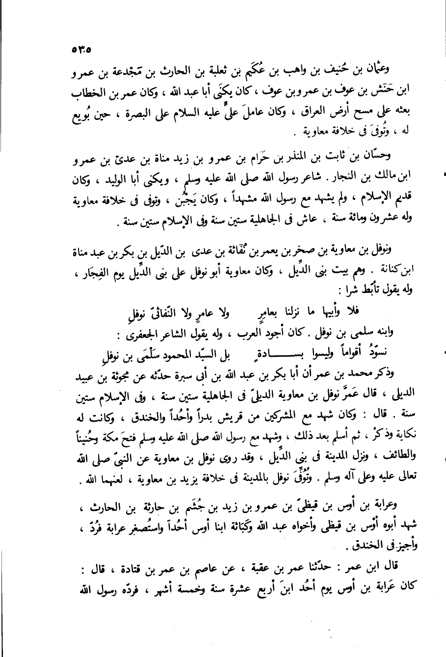 ونوفل بن معاويه بن صخر بن يعمر بن نفاثه بن عدى بن الديل بن بكر بن عبد مناه ابن كنانه وهم بيت بنى الديل، وكان معاويه ابو نوفل على بنى الديل يوم الفجار، وله يقول تابط شرا: