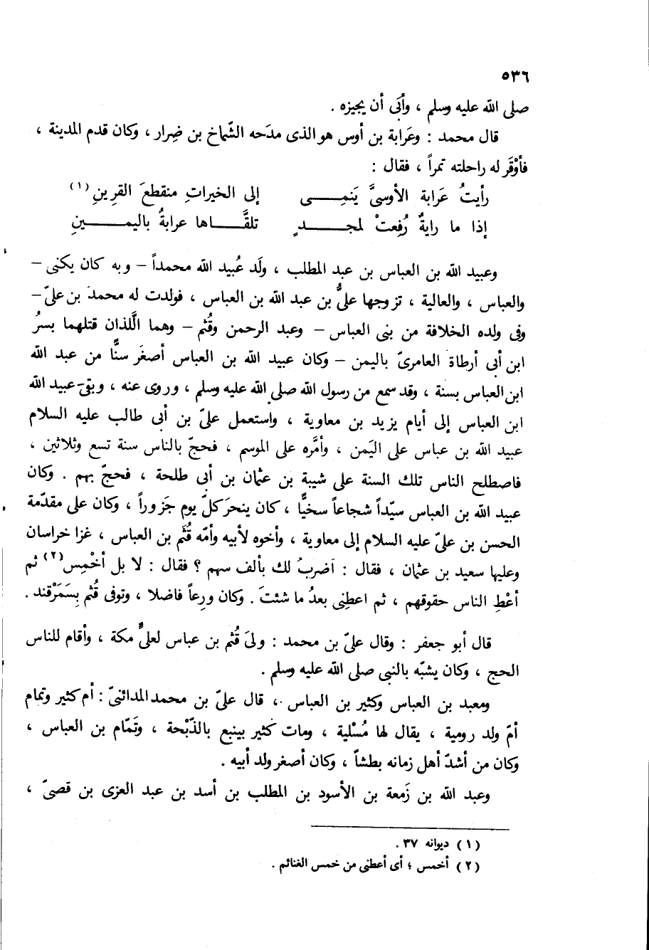 وعبيد الله بن العباس بن عبد المطلب، ولد عبيد الله محمدا- وبه كان يكنى والعباس، والعاليه، تزوجها على بن عبد الله بن العباس، فولدت له محمد بن على- وفي ولده الخلافه من بنى العباس- وعبد الرحمن وقثم- وهما اللذان قتلهما بسر ابن ابى ارطاه العامري باليمن- وكان عبيد الله بن العباس اصغر سنا من عبد الله ابن العباس بسنه، وقد سَمِعَ مِنْ رَسُولِ اللَّهِ صَلَّى اللَّهُ عَلَيْهِ وَسَلَّمَ، وروى عنه، وبقي عبيد الله ابن العباس الى ايام يزيد بن معاويه، واستعمل على بن ابى طالب ع عبيد الله بن عباس على اليمن، وامره على الموسم، فحج بالناس سنه تسع وثلاثين، فاصطلح الناس تلك السنه عَلَى شيبة بن عُثْمَانَ بن أبي طَلْحَة، فحج بهم وكان عبيد الله بن العباس سيدا شجاعا سخيا، كان ينحر كل يوم جزورا، وكان على مقدمه الْحَسَن بن علي عَلَيْهِ السلام إِلَى مُعَاوِيَةَ، واخوه لأبيه وأمه قثم بن العباس، غزا خراسان وعليها سعيد بن عثمان، فقال: اضرب لك بألف سهم؟ فقال: لا بل اخمس ثم اعط الناس حقوقهم، ثم أعطني بعد ما شئت وكان ورعا فاضلا، وتوفى قثم بسمرقند.