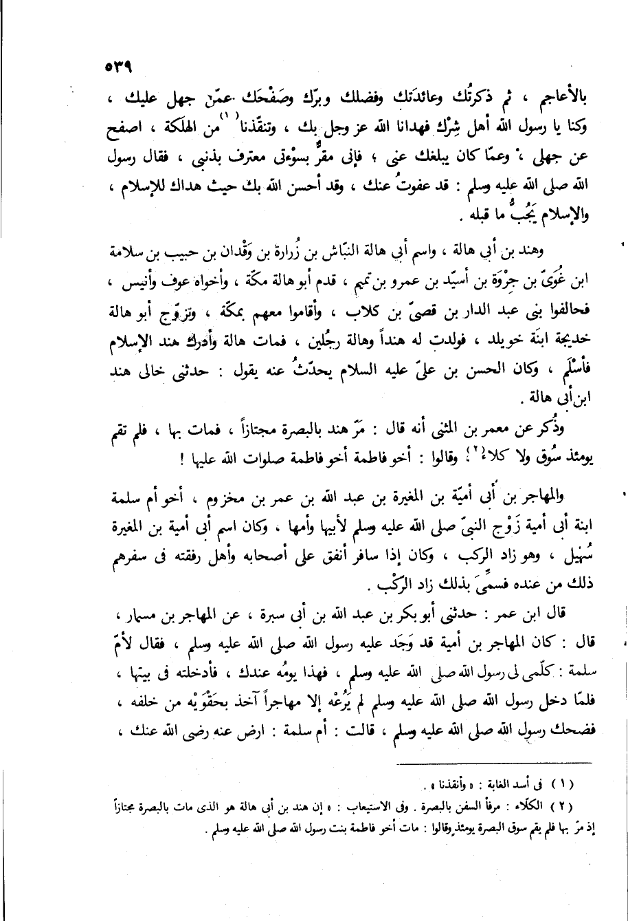 وذكر عن معمر بن المثنى انه قال: مر هند بالبصرة مجتازا، فمات بها، فلم تقم يومئذ سوق ولا كلاء، وقالوا: أخو فاطمه أخو فاطمه صلوات الله عليها! والمهاجر بن أبي أمية بْن المغيرة بْن عبد الله بْن عمر بن مخزوم، أخو أم سلمه ابنه ابى اميه زوج النبي صلى الله عليه وسلم لأبيها وأمها، وكان اسم ابى اميه بن المغيره سهيل، وهو زاد الركب، وكان إذا سافر انفق على اصحابه واهل رفقته في سفرهم ذلك من عنده فسمى بذلك زاد الركب.