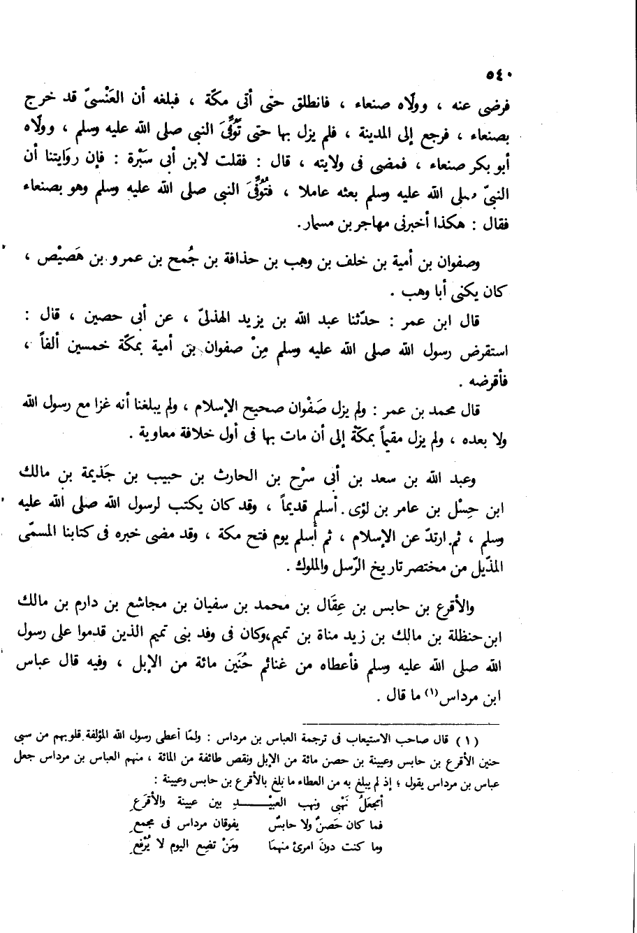 فرضى عنه، وولاه صنعاء، فانطلق حتى اتى مكة، فبلغه ان العنسي قد خرج بصنعاء، فرجع الى المدينة، فلم يزل بها حتى توفى النبي صلى الله عليه وسلم، وولاه ابو بكر صنعاء، فمضى في ولايته، قال: فقلت لابن ابى سبره: فان روايتنا ان النبي صلى الله عليه وسلم بعثه عاملا، فتوفى النبي صلى الله عليه وسلم وهو بصنعاء فقال: هكذا أخبرني مهاجر بن مسمار. وصفوان بن اميه بن خلف بن وهب بن حذافة بن جمح بن عمرو بن هصيص، كان يكنى أبا وهب.