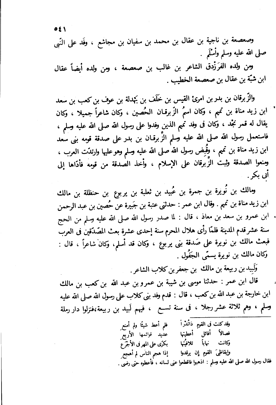 ومالك بن نويره بن جمره بن عبيد بن ثعلبة بن يربوع بن حنظله بن مالك ابن زيد مناه بن تميم وقال ابن عمر: حدثنى عتبة بن جبيرة عن حصين بن عبد الرحمن ابن عمرو بن سعد بن معاذ، قال: لما صدر رسول الله صلى الله عليه وسلم من الحج سنه عشر قدم المدينة فلما راى هلال المحرم سنه احدى عشره بعث المصدقين في العرب فبعث مالك بن نويره على صدقه بنى يربوع، وكان قد اسلم، وكان شاعرا، قال: