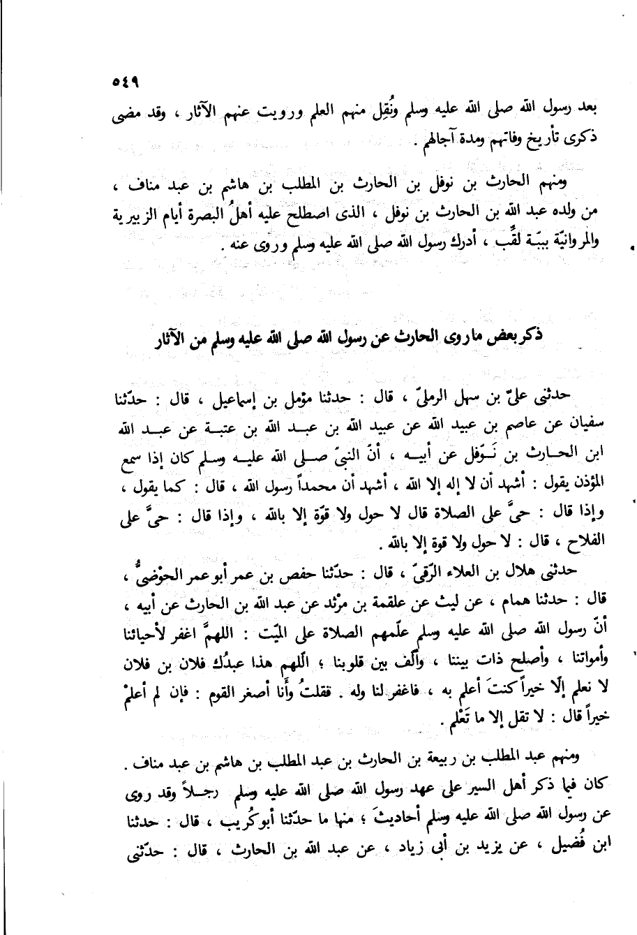 ومنهم الحارث بن نوفل بن الحارث بن المطلب بن هاشم بن عبد مناف، من ولده عبد الله بن الحارث بن نوفل، الذى اصطلح عليه اهل البصره ايام الزبيريه والمروانية بببه لقب، أدرك رسول اللَّه صَلَّى اللَّهُ عَلَيْهِ وَسَلَّمَ وروى عنه.