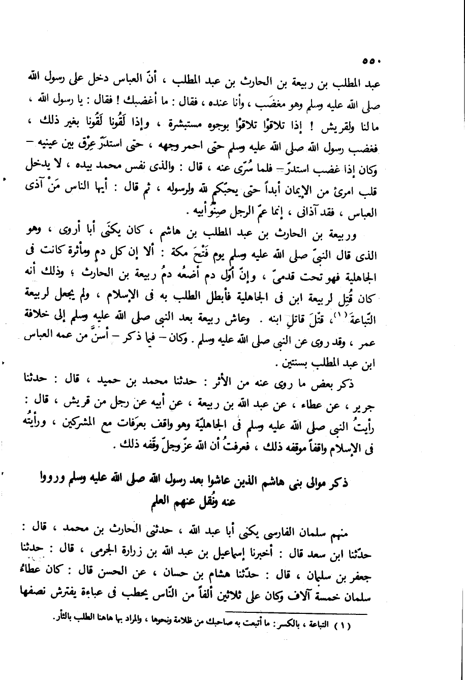 عبد المطلب بْن رَبِيعَة بْن الْحَارِث بْن عبد المطلب، ان العباس دخل عَلَى رَسُول اللَّهِ صلى اللَّه عَلَيْهِ وَسَلَّمَ وهو مغضب، وانا عنده، فقال: ما اغضبك! فقال: يا رسول الله، ما لنا ولقريش! إذا تلاقوا تلاقوا بوجوه مستبشره، وإذا لقونا لقونا بغير ذلك، فَغَضِبَ رَسُولُ اللَّهِ صَلَّى اللَّهُ عَلَيْهِ وَسَلَّمَ حتى احمر وجهه، حتى استدر عرق بين عينيه- وكان إذا غضب استدر- فلما سرى عنه، [قال: والذى نفس محمد بيده، لا يدخل قلب امرئ من الايمان ابدا حتى يحبكم لله ولرسوله، ثم قال: ايها الناس من آذى العباس، فقد آذاني، انما عم الرجل صنو ابيه] .