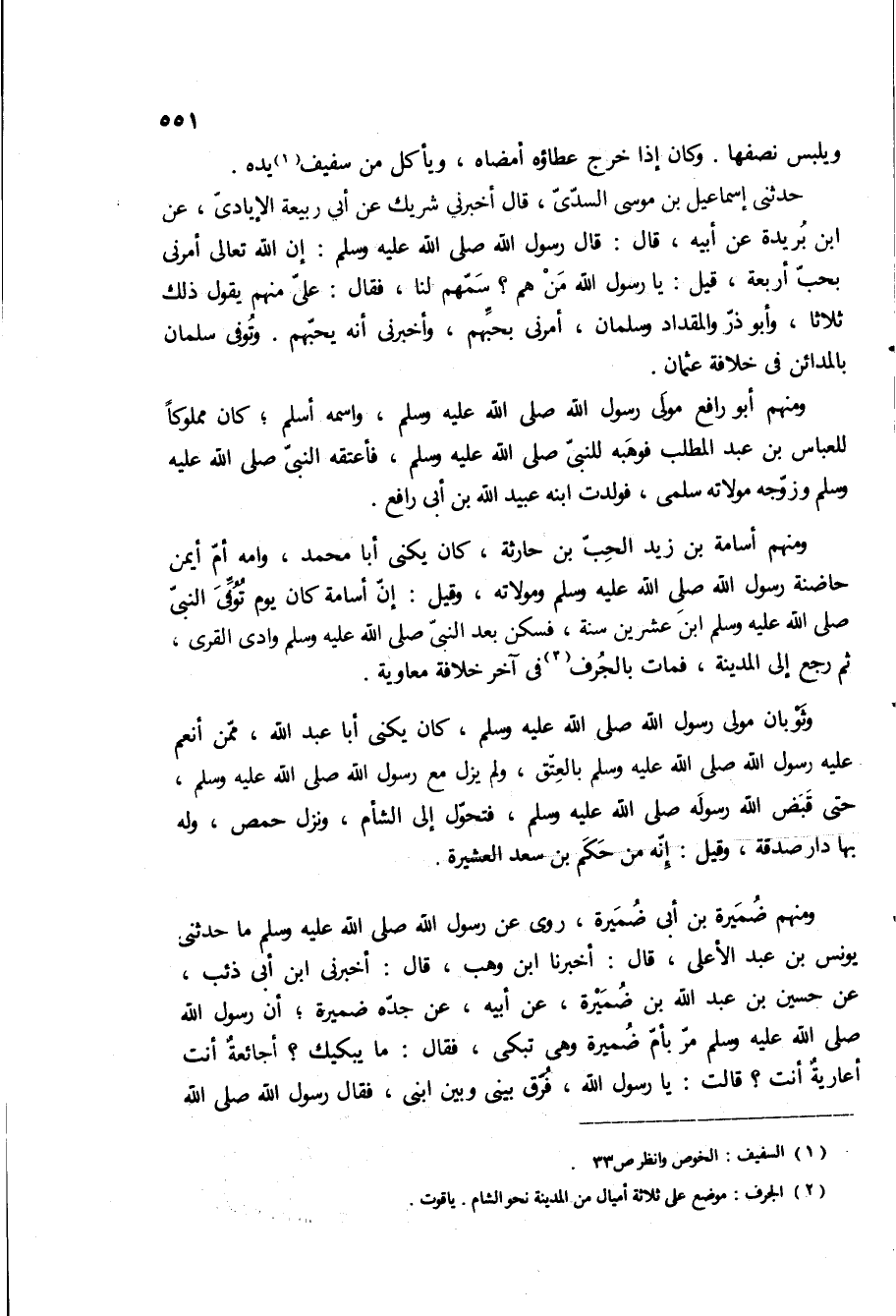 حدثنى اسماعيل بن موسى السدى، قال أخبرني شريك عن ابى ربيعه الأيادي، عن ابن بريده عَنْ أَبِيهِ، قَالَ: [قَالَ رَسُولُ اللَّهِ صَلَّى اللَّهُ عَلَيْهِ وَسَلَّمَ: ان الله تعالى أمرني بحب اربعه، قيل: يا رسول الله من هم؟ سمهم لنا، فقال: على منهم يقول ذلك ثلاثا، وابو ذر والمقداد وسلمان، أمرني بحبهم، وأخبرني انه يحبهم] وتوفى سلمان بالمدائن في خلافه عثمان.