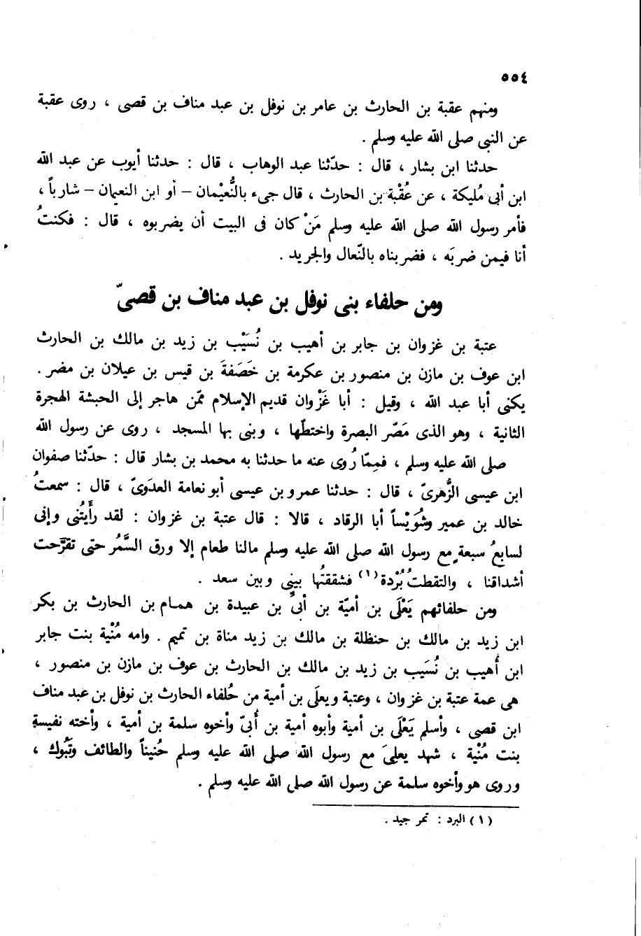 ومنهم عقبه بْنُ الْحَارِثِ بْنِ عَامِرِ بْنِ نَوْفَلِ بْنِ عبد مناف بن قصى، روى عقبه عن النَّبِيِّ صَلَّى اللَّهُ عَلَيْهِ وَسَلَّمَ.