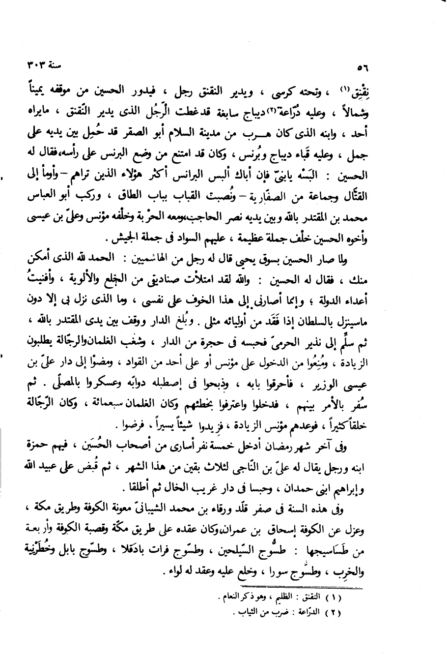 نقنق، وتحته كرسي، ويدير النقنق رجل، فيدور الحسين من موقفه يمينا وشمالا، وعليه دراعه ديباج سابغه قد غطت الرجل الذى يدير النقنق، ما يراه احد، وابنه الذى كان هرب من مدينه السلام ابو الصقر قد حمل بين يديه على جمل، وعليه قباء ديباج وبرنس، وكان قد امتنع من وضع البرنس على راسه، فقال له الحسين: البسه يا بنى فان اباك البس البرانس اكثر هؤلاء الذين تراهم- وأومأ الى القتال وجماعه من الصفاريه- ونصبت القباب بباب الطاق، وركب ابو العباس محمد بن المقتدر بالله وبين يديه نصر الحاجب، ومعه الحربه وخلفه مؤنس وعلى بن عيسى واخوه الحسين خلف جمله عظيمه، عليهم السواد في جمله الجيش.