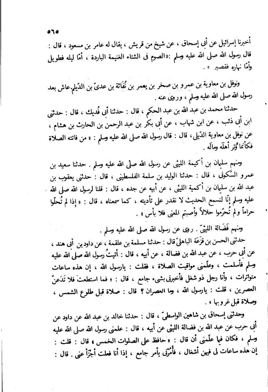وحدثنى إِسْحَاقُ بْنُ شَاهِينَ الْوَاسِطِيُّ، قَالَ: حَدَّثَنَا خَالِدٌ بن عبد الله عن داود عن ابى حرب عن عبد الله بن فضالة الليثى عن ابيه، [قال: علمني رسول الله ص، فكان فيما علمني ان قال: حافظ على الصلوات الخمس قال: قلت: