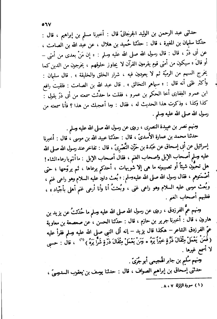 حدثنا سليمان بن المغيره، قال: حدثنا حميد بن هلال، عن عبد الله بن الصامت، عَنْ أَبِي ذَرٍّ، قَالَ: [قَالَ رَسُولُ اللَّهِ ص: ان من بعدي من امتى- او قال سيكون من امتى قوم يقرءون القرآن لا يجاوز حلوقهم، يخرجون من الدين كما يخرج السهم من الرميه ثم لا يعودون فيه، شرار الخلق والخليقة] قال سليمان: