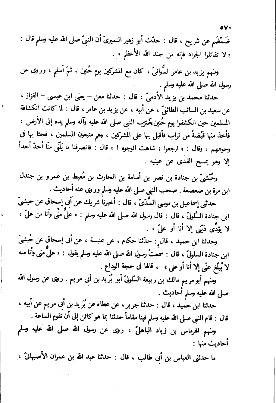 حَدَّثَنَا مُحَمَّدُ بْنُ يَزِيدَ الأَدَمِيُّ، قَالَ: حَدَّثَنَا معن- يعنى ابن عيسى- القزاز، عن سعيد بن السائب الطائفى، عن ابيه، عن يزيد بن عامر، قال: [لما كانت انكشافه المسلمين حين انكشفوا يوم حنين، ضرب النبي ص يده الى الارض، فاخذ منها قبضه من تراب فاقبل بها على المشركين، وهم متبعون المسلمين، فحثا بها في وجوههم، وقال: ارجعوا، شاهت الوجوه! قال: فانصرفنا ما يلقى منا احد أحدا الا وهو يمسح القدى عن عينيه] .
