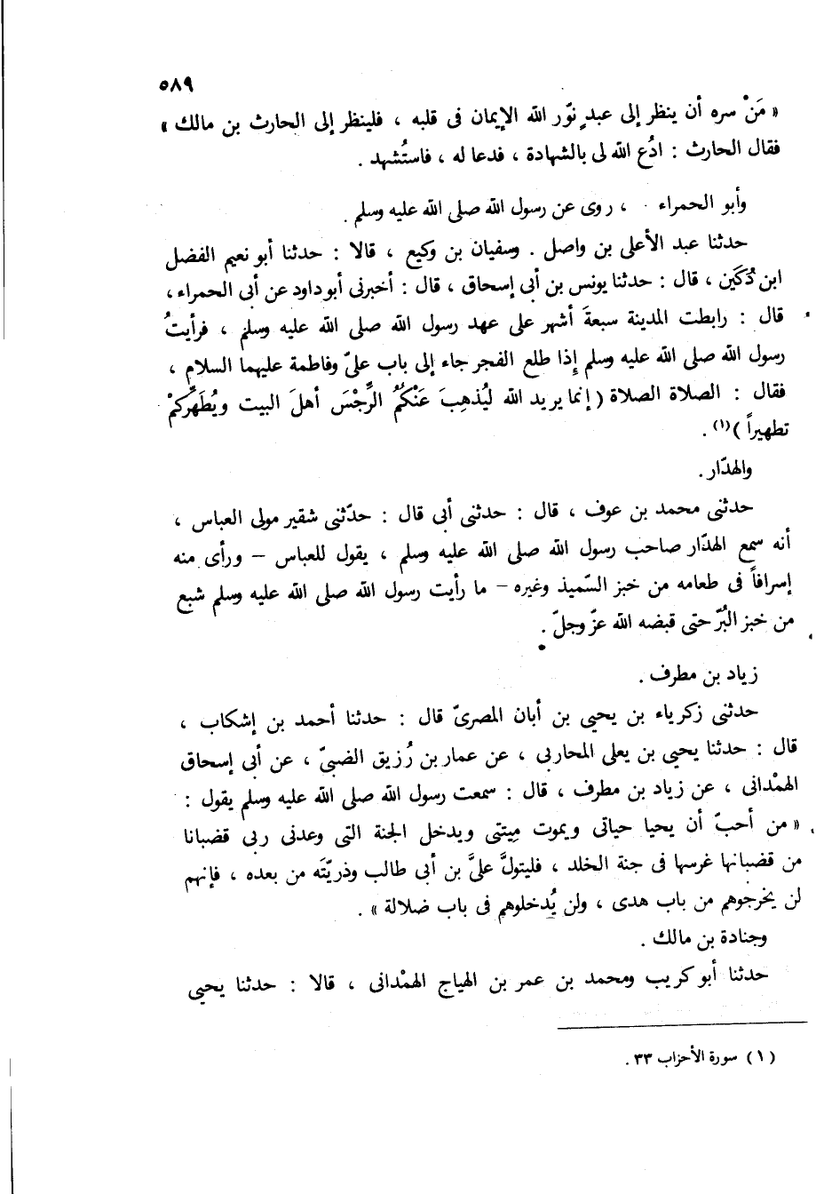 حدثنى زَكَرِيَّاءُ بْنُ يَحْيَى بْنِ أَبَانٍ الْمِصْرِيُّ قَالَ: حدثنا احمد بن إشكاب، قال: حدثنا يحيى بن يعلى المحاربى، عن عمار بن رزيق الضبي، عن ابى إسحاق الهمدانى، عن زياد بن مطرف، قال: [سمعت رسول الله ص يقول:
