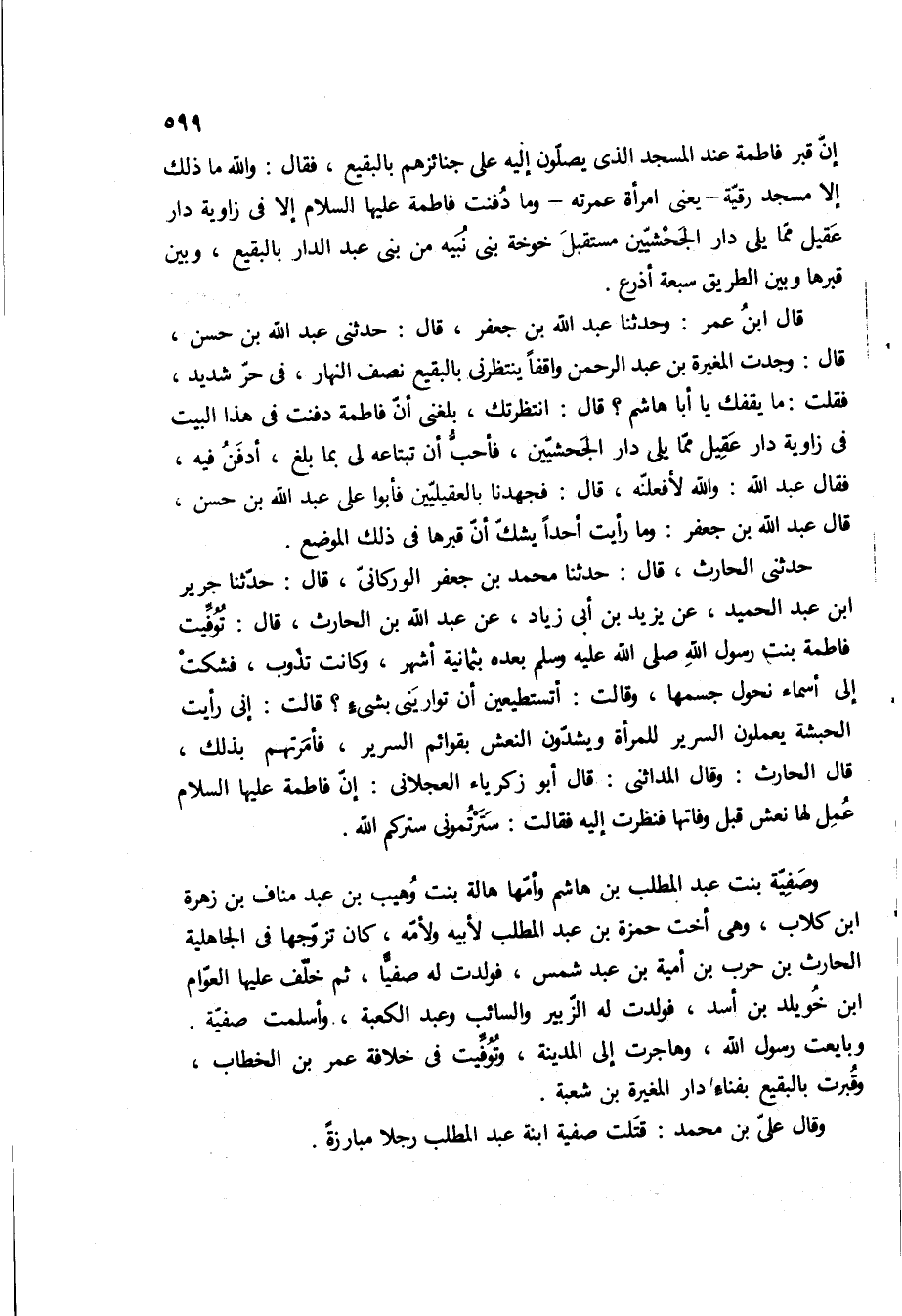 قال ابن عمر: وحدثنا عبد الله بن جعفر، قال: حدثنى عبد الله بن حسن، قال: وجدت المغيره بن عبد الرحمن واقفا ينتظرني بالبقيع نصف النهار، في حر شديد، فقلت: ما يقفك يا أبا هاشم؟ قال: انتظرتك، بلغنى ان فاطمه دفنت في هذا البيت في زاوية دار عقيل مما يلى دار الجحشيين، فأحب ان تبتاعه لي بما بلغ، ادفن فيه، فقال عبد الله: والله لأفعلنه، قال: فجهدنا بالعقيليين فأبوا على عبد الله بن حسن، قال عبد الله بن جعفر: وما رايت أحدا يشك ان قبرها في ذلك الموضع.