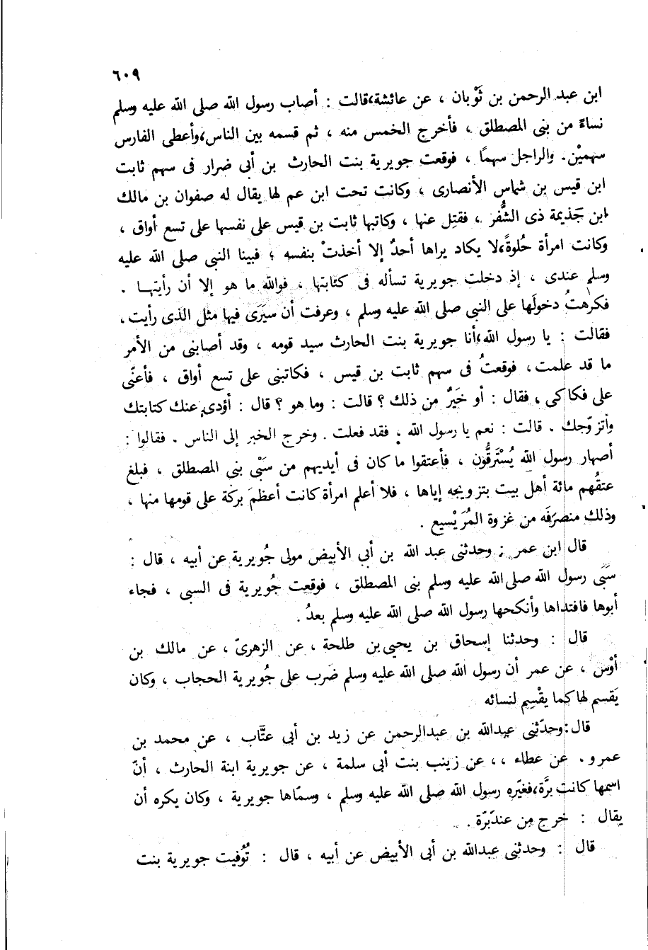 ابن عبد الرحمن بن ثوبان، عن عائشة، قالت: أصاب رسول الله ص نساء من بنى المصطلق، فاخرج الخمس منه، ثم قسمه بين الناس، واعطى الفارس سهمين، والراجل سهما، فوقعت جويرية بنت الحارث بن ابى ضرار في سهم ثابت ابن قيس بن شماس الأنصاري، وكانت تحت ابن عم لها يقال له صفوان بن مالك ابن جذيمة ذي الشفر، فقتل عنها، وكاتبها ثابت بن قيس على نفسها على تسع اواق، وكانت امراه حلوه، لا يكاد يراها احد الا أخذت بنفسه، فبينا النبي ص عندي، إذ دخلت جويرية تسأله في كتابتها، فو الله ما هو الا ان رايتها، فكرهت دخولها على النبي ص، وعرفت ان سيرى فيها مثل الذى رايت، فَقَالَتْ: يَا رَسُولَ اللَّهِ، أَنَا جُوَيْرِيَةُ بِنْتُ الحارث سيد قومه، وقد أصابني من الأمر ما قد علمت، فوقعت في سهم ثابت بن قيس، فكاتبني على تسع اواق، فاعنى على فكاكي، فقال: او خير من ذلك؟ قالت: وما هو؟ قال: أؤدي عنك كِتَابَتَكِ وَأَتَزَّوَجُكِ، قَالَتْ: نَعَمْ يَا رَسُولَ اللَّهِ، فقد فعلت وخرج الخبر الى الناس، فقالوا: