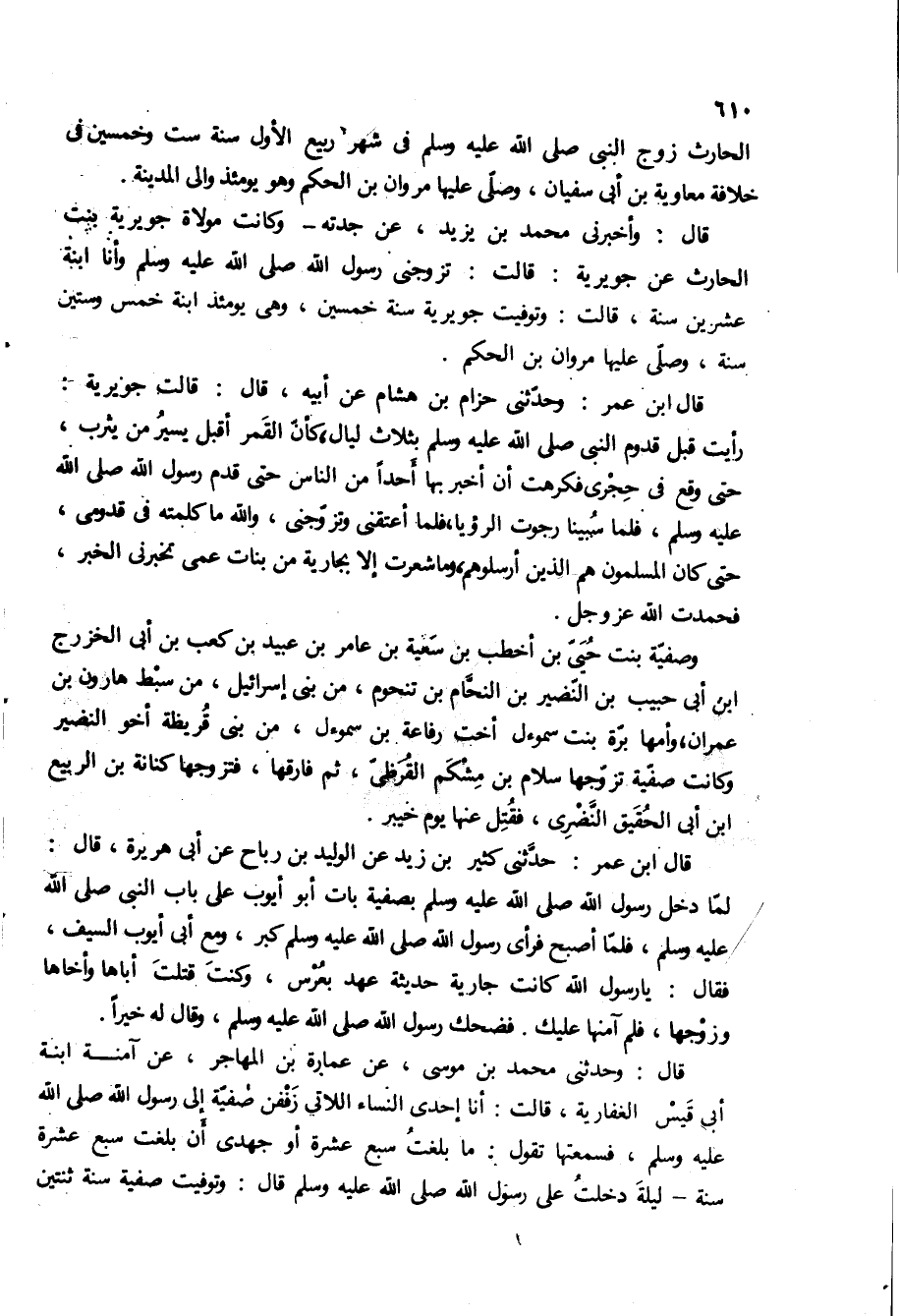 قال: وحدثنى محمد بن موسى، عن عماره بن المهاجر، عن آمنه ابنه ابى قيس الغفارية، قالت: انا احدى النساء اللاتي زففن صفيه إلى رسول الله صلى الله عليه وَسَلَّمَ، فسمعتها تقول: ما بلغت سبع عشره او جهدي ان بلغت سبع عشره سنه- ليله دخلت على رسول الله ص قال: وتوفيت صفيه سنه ثنتين