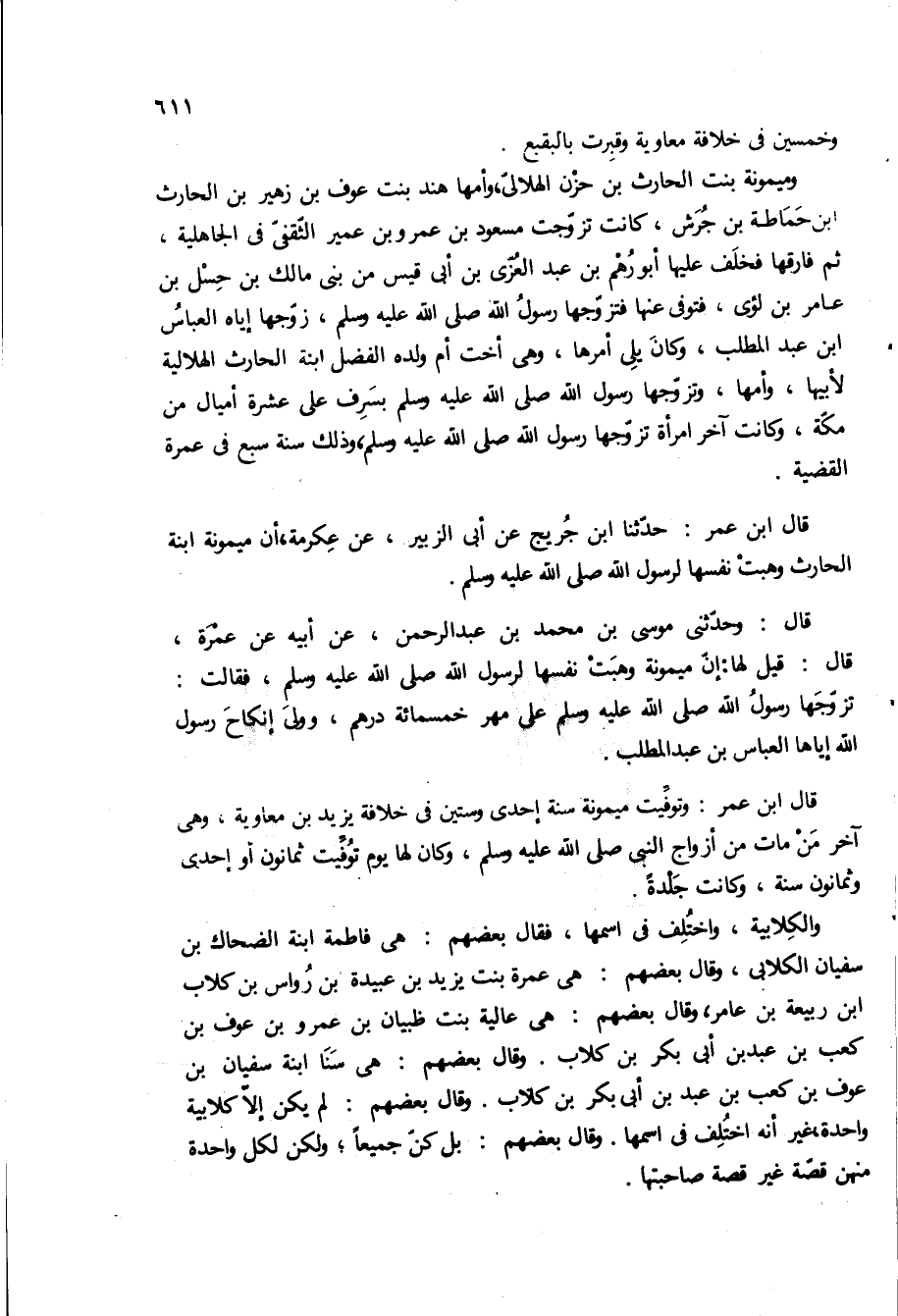 وميمونه بنت الحارث بن حزن الهلالي، وأمها هند بنت عوف بن زهير بن الحارث ابن حماطه بن جرش، كانت تزوجت مسعود بن عمرو بن عمير الثقفى في الجاهلية، ثم فارقها فخلف عليها ابو رَهْمِ بْنِ عَبْدِ الْعُزَّى بْنِ أَبِي قَيْسِ من بني مَالِكِ بْنِ حِسْلِ بْنِ عَامِرِ بْنِ لُؤَيٍّ، فتوفى عنها فتزوجها رسول الله ص، زوجها اياه العباس ابن عبد المطلب، وكان يلى امرها، وهي اخت أم ولده الفضل ابنه الحارث الهلالية لأبيها، وأمها، وتزوجها رسول الله ص وسلم بسرف على عشره اميال من مكة، وكانت آخر امراه تزوجها رسول الله ص، وذلك سنه سبع في عمره القضية قال ابن عمر: حدثنا ابن جريج عن ابى الزبير، عن عكرمه، ان ميمونه ابنه الحارث وهبت نفسها لرسول الله ص.
