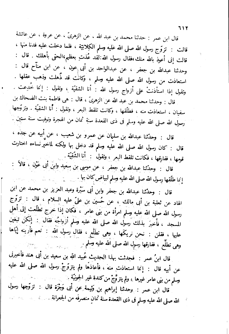 قال ابن عمر: حدثنا مُحَمَّدُ بْنُ عَبْدِ اللَّهِ، عَنِ الزُّهْرِيِّ، عَنْ عروه، عن عائشة قالت: تزوج رسول الله ص الكلابية، فلما دخلت عليه فدنا منها، قالت انى اعوذ بالله منك، فقال رسول الله: لقد عذت بعظيم، الحق باهلك قال: