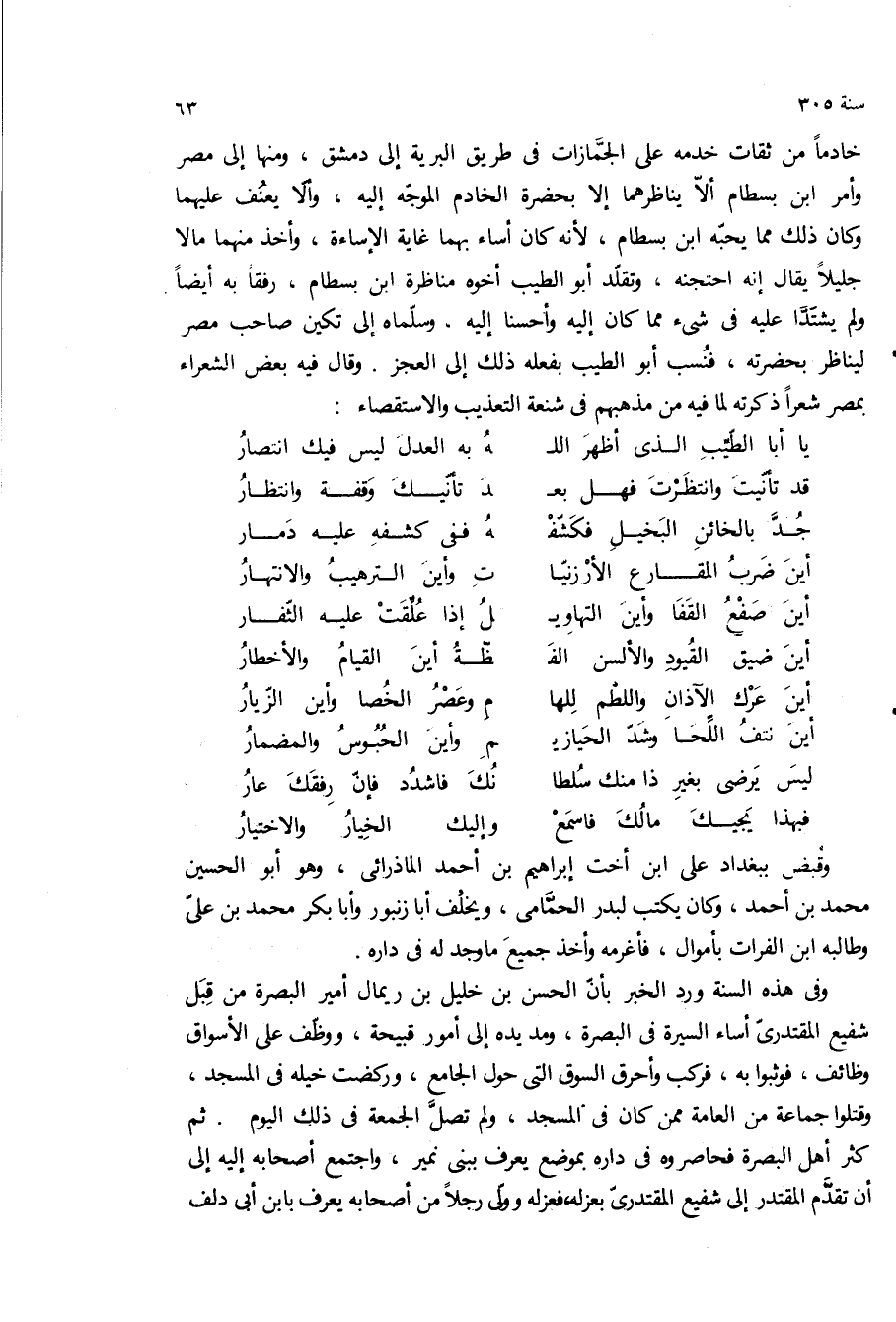 وقبض ببغداد على ابن اخت ابراهيم بن احمد الماذرائى، وهو ابو الحسين محمد بن احمد، وكان يكتب لبدر الحمامي، ويخلف أبا زنبور وأبا بكر محمد بن على وطالبه ابن الفرات باموال، فاغرمه وأخذ جميع ما وجد له في داره.