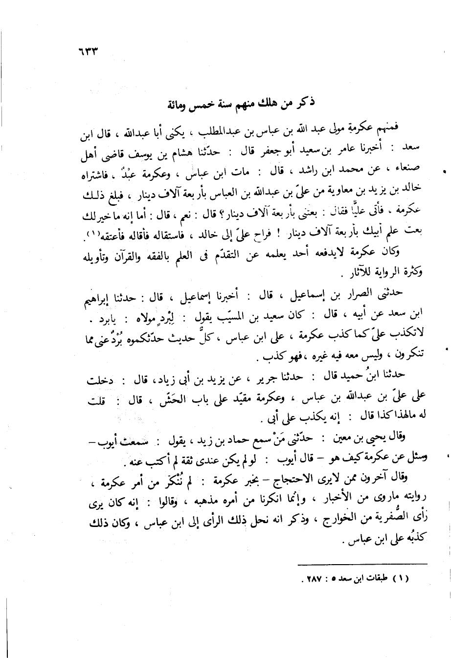 فمنهم عكرمه مولى عبد الله بْن عباس بْن عبد المطلب، يكنى أبا عبد الله، قال ابن سعد: أخبرنا عامر بن سعيد ابو جعفر قال: حدثنا هشام بن يوسف قاضى اهل صنعاء، عن محمد ابن راشد، قال: مات ابن عباس، وعكرمه عبد، فاشتراه خالد بن يزيد بن معاويه من على بن عبد الله بن العباس باربعه آلاف دينار، فبلغ ذلك عكرمه، فاتى عليا فقال: بعتني باربعه آلاف دينار؟ قال: نعم، قال: اما انه ما خير لك بعت علم ابيك باربعه آلاف دينار! فراح على الى خالد، فاستقاله فاقاله فاعتقه.