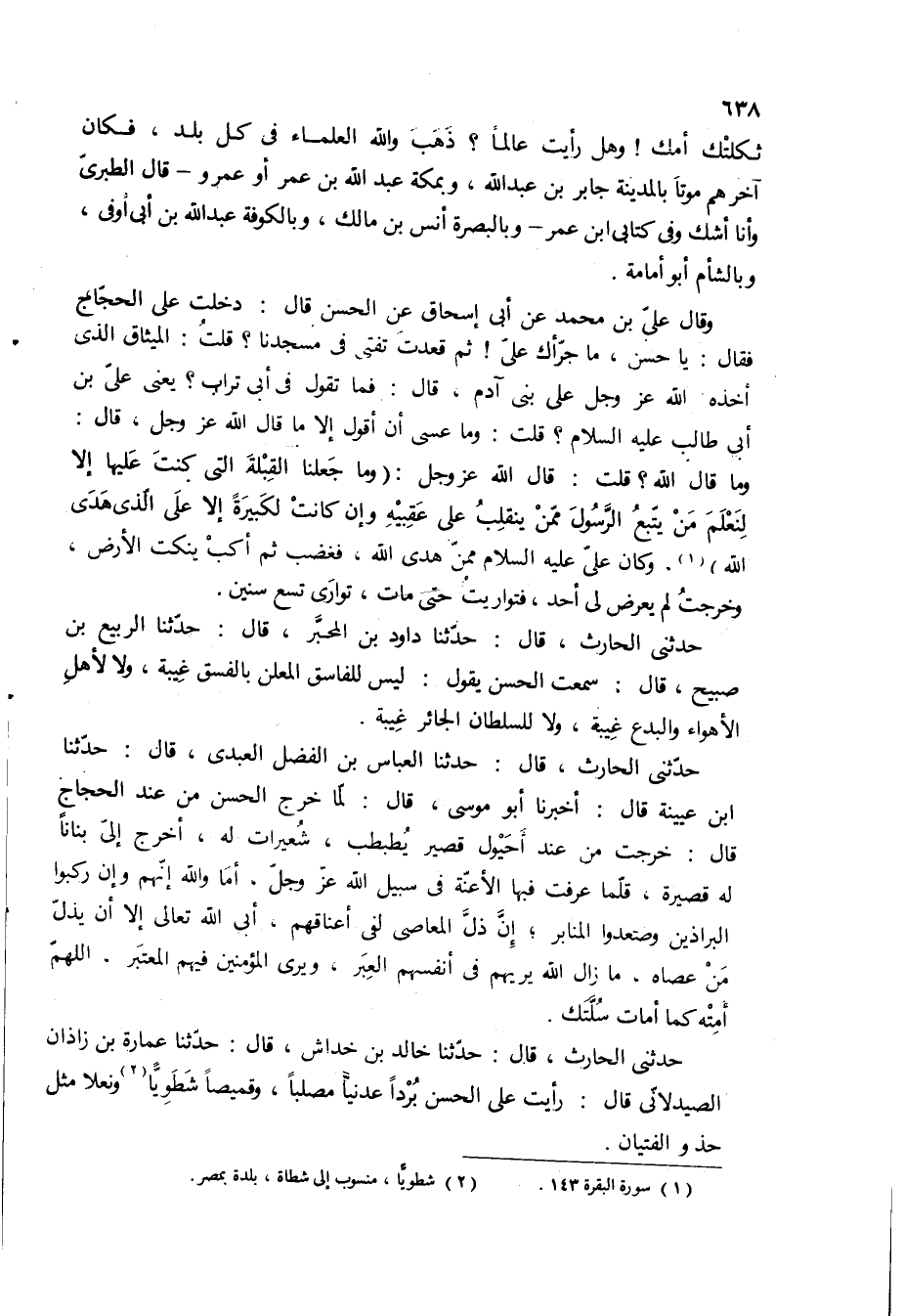 حدثنى الحارث، قال: حدثنا خالد بن خداش، قال: حدثنا عماره بن زاذان الصيدلاني قال: رايت على الحسن بردا عدنيا مصلبا، وقميصا شطويا ونعلا مثل حذو الفتيان
