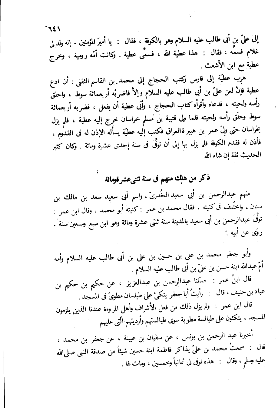 قال ابن عمر: ولم يزل ذلك من فعل الاشراف واهل المروءة عندنا الذين يلزمون المسجد، يتكئون على طيالسه مطوية سوى طيالستهم وأرديتهم التي عليهم أخبرنا عبد الرحمن بن يونس، عن سفيان بن عيينه، عن جعفر بن محمد، قال: سمعت محمد بن على يذاكر فاطمه ابنه حسين شيئا من صدقه النبي صلى الله عليه وسلم، وقال: هذه توفى لي ثمانيا وخمسين، ومات لها