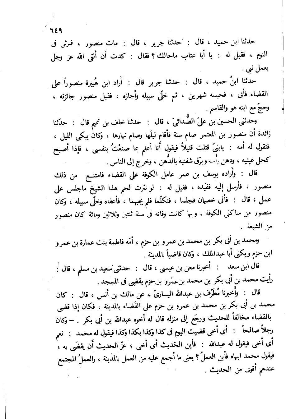 حدثنا ابن حميد، قال: حدثنا جرير، قال: مات منصور، فرئي في النوم، فقيل له: يا أبا عتاب ما حالك؟ فقال: كدت ان القى الله عز وجل بعمل نبى.
