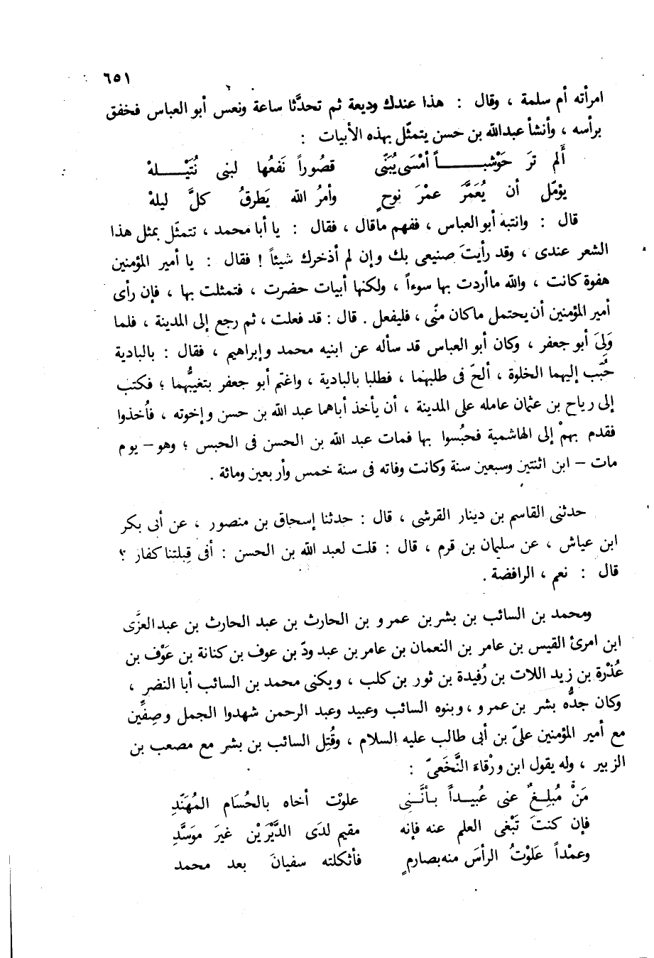 امراته أم سلمه، وقال: هذا عندك وديعة ثم تحدثا ساعه ونعس ابو العباس فخفق برأسه، وأنشأ عبد الله بن حسن يتمثل بهذه الأبيات: