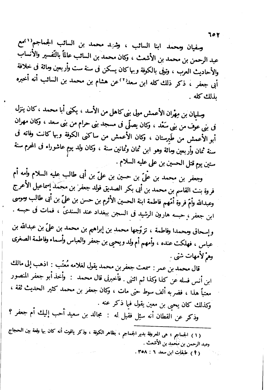 وجعفر بْن محمد بْن علي بْن حسين بْن على بن ابى طالب ع وأمه أم فروه بنت القاسم بن محمد بن ابى بكر الصديق فولد جعفر بن محمد اسماعيل الاعرج وعبد الله وأم فروه أمهم فاطمه ابنه الحسين الأثرم بْن حسن بْن علي بْن أبي طالب وموسى ابن جعفر، حبسه هارون الرشيد في السجن ببغداد عند السندي، فمات في حبسه.