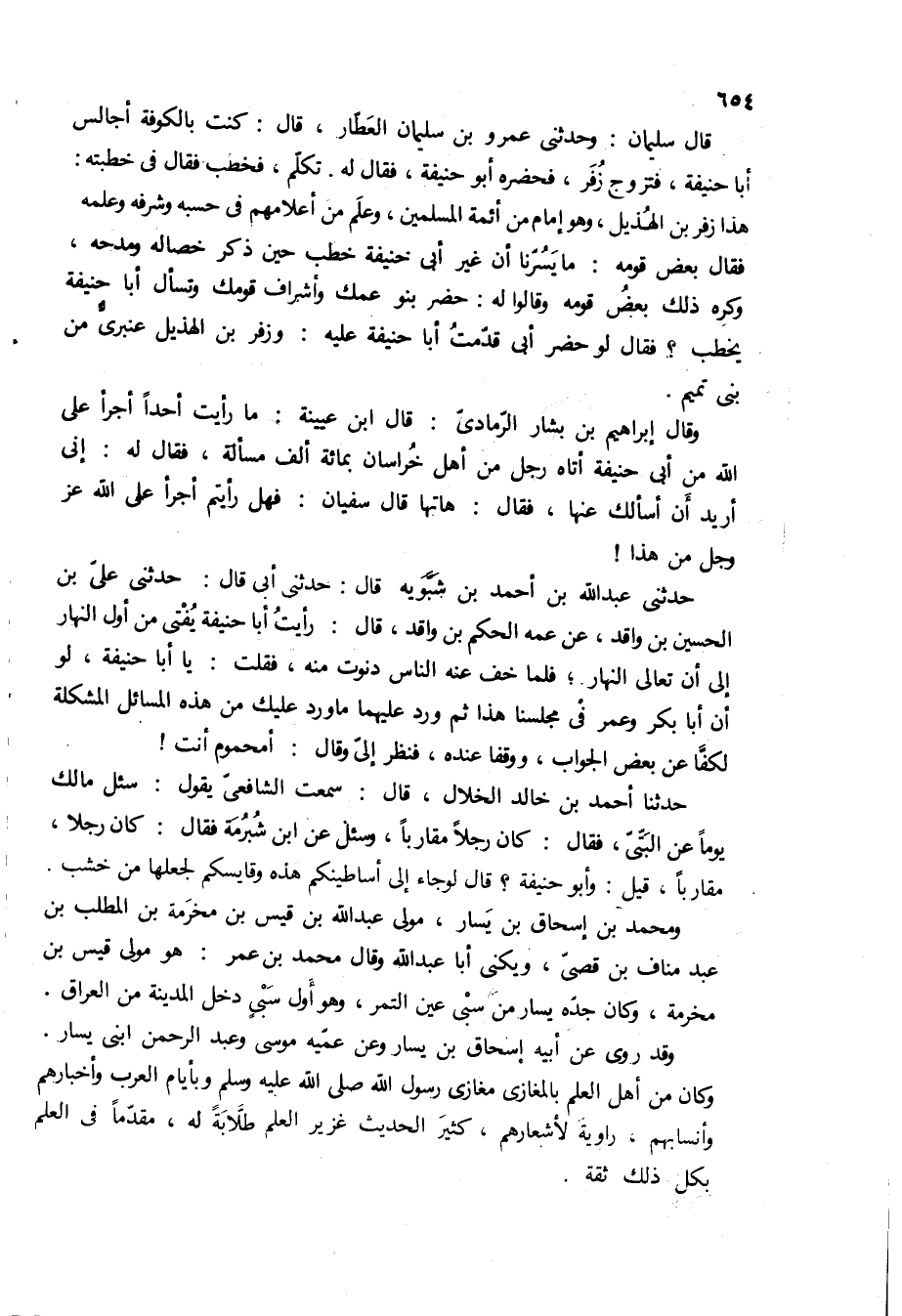 هذا زفر بن الهذيل، وهو امام من ائمه المسلمين، وعلم من اعلامهم في حسبه وشرفه وعلمه فقال بعض قومه: ما يسرنا ان غير ابى حنيفه خطب حين ذكر خصاله ومدحه، وكره ذلك بعض قومه وقالوا له: حضر بنو عمك واشراف قومك وتسال أبا حنيفه يخطب؟ فقال لو حضر ابى قدمت أبا حنيفه عليه: وزفر بن الهذيل عنبرى من بنى تميم.