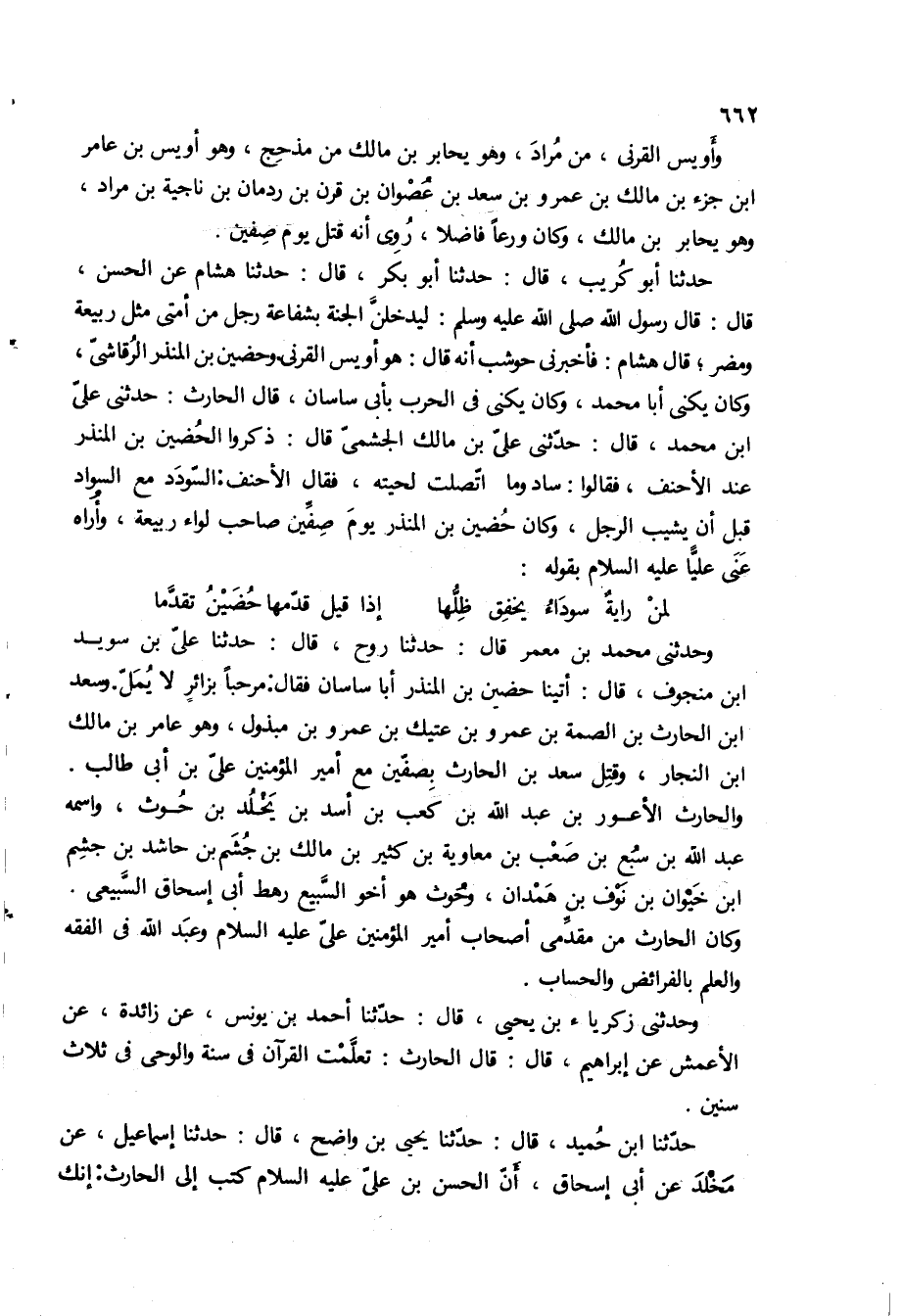 حَدَّثَنَا أَبُو كُرَيْبٍ، قَالَ: حَدَّثَنَا أَبُو بَكْرِ، قال: حدثنا هشام عن الحسن، قال: [قال رسول الله ص: ليدخلن الجنه بشفاعة رجل من امتى مثل ربيعه ومضر،] قال هشام: فأخبرني حوشب انه قال: هو اويس القرني وحضين بن المنذر الرقاشى، وكان يكنى أبا محمد، وكان يكنى في الحرب بابى ساسان، قال الحارث: حدثنى على ابن محمد، قال: حدثنى على بن مالك الجشمى قال: ذكروا الحضين بن المنذر عند الأحنف، فقالوا: ساد وما اتصلت لحيته، فقال الأحنف: السودد مع السواد قبل ان يشيب الرجل، وكان حضين بن المنذر يوم صفين صاحب لواء ربيعه، وأراه عنى عليا ع بقوله: