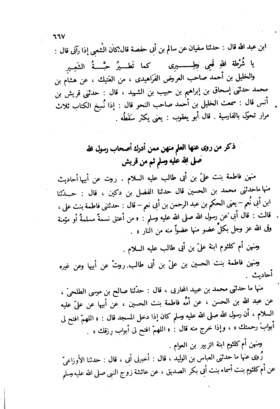 منهن فاطمه بنت على بن ابى طالب ع روت عن أبيها احاديث منها مَا حَدَّثَنِي مُحَمَّدُ بْنُ الْحُسَيْنِ قَالَ حَدَّثَنَا الفضل بن دكين، قال: حدثنا ابن ابى نعم- يعنى الحكم بن عبد الرحمن بن ابى نعم- قال: حدثتني فاطمه بنت على، [قالت: قال ابى عن رسول الله ص: من اعتق نسمه مسلمه او مؤمنة وقى الله عز وجل بكل عضو منها عضوا منه من النار] .