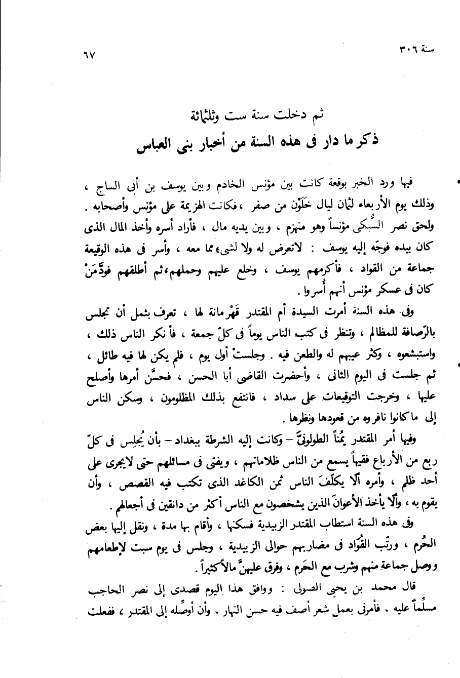 (ذكر ما دار في هذه السنه من اخبار بنى العباس) فيها ورد الخبر بوقعه كانت بين مؤنس الخادم وبين يوسف بن ابى الساج، وذلك يوم الأربعاء لثمان ليال خلون من صفر، فكانت الهزيمة على مؤنس واصحابه.