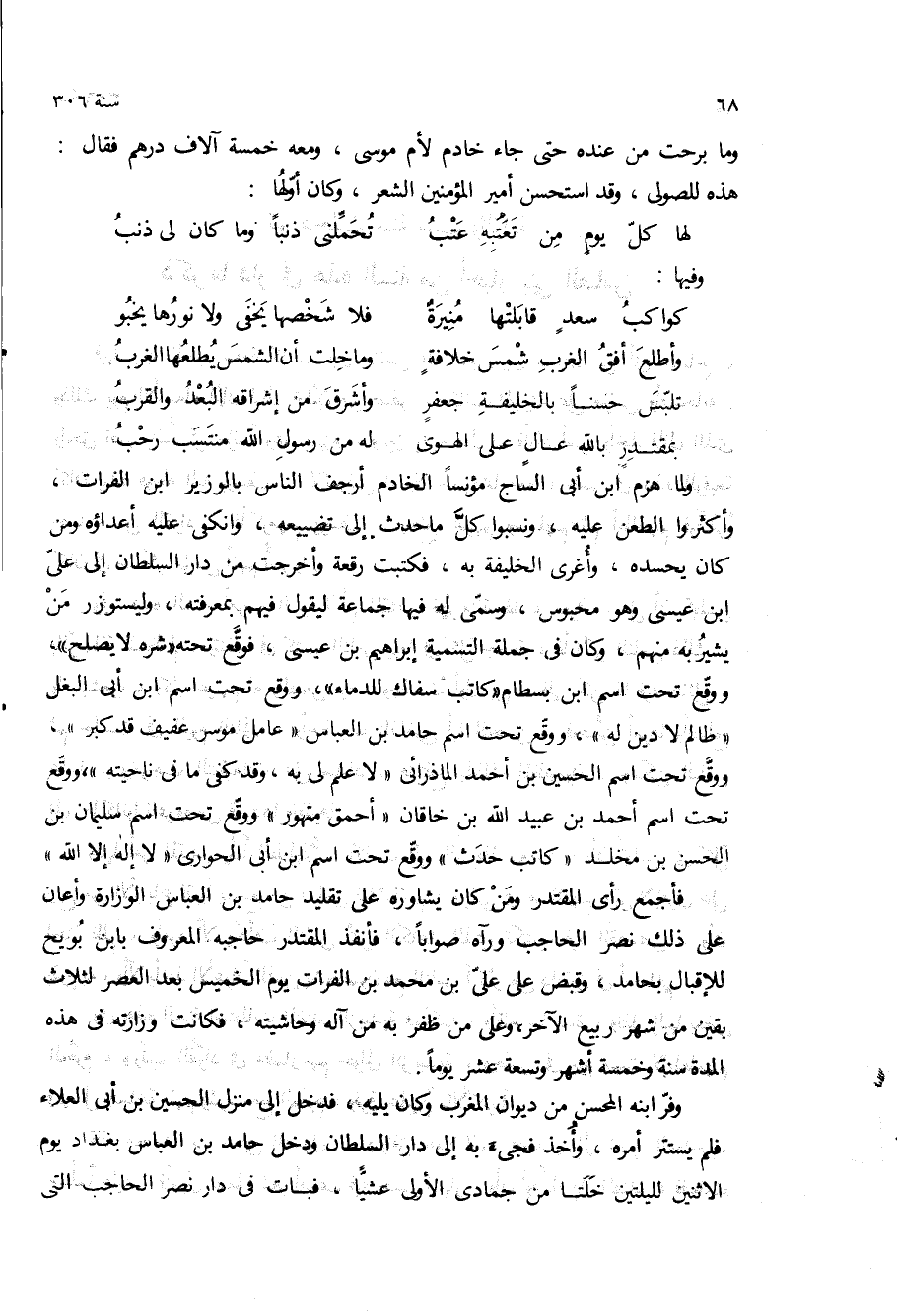 ولما هزم ابن ابى الساج مؤنسا الخادم ارجف الناس بالوزير ابن الفرات، وأكثروا الطعن عليه، ونسبوا كل ما حدث الى تضييعه، وانكفى عليه اعداؤه ومن كان يحسده، واغرى الخليفة به، فكتبت رقعه واخرجت من دار السلطان الى على ابن عيسى وهو محبوس، وسمى له فيها جماعه ليقول فيهم بمعرفته، وليستوزر من يشير به منهم، وكان في جمله التسميه ابراهيم بن عيسى، فوقع تحته شره لا يصلح، ووقع تحت اسم ابن بسطام كاتب سفاك للدماء، ووقع تحت اسم ابن ابى البغل ظالم لا دين له، ووقع تحت اسم حامد بن العباس عامل موسر عفيف قد كبر، ووقع تحت اسم الحسين بن احمد الماذرائى لا علم لي به، وقد كفى ما في ناحيته، ووقع تحت اسم احمد بن عبيد الله بن خاقان احمق متهور ووقع تحت اسم سليمان بن الحسن بن مخلد كاتب حدث ووقع تحت اسم ابن ابى الحوارى لا اله الا الله فاجمع راى المقتدر ومن كان يشاوره على تقليد حامد بن العباس الوزارة واعان على ذلك نصر الحاجب ورآه صوابا، فانفذ المقتدر حاجبه المعروف بابن بويح للإقبال بحامد، وقبض على على بن محمد بن الفرات يوم الخميس بعد العصر لثلاث بقين من شهر ربيع الآخر، وعلى من ظفر به من آله وحاشيته، فكانت وزارته في هذه المده سنه وخمسه اشهر وتسعه عشر يوما.