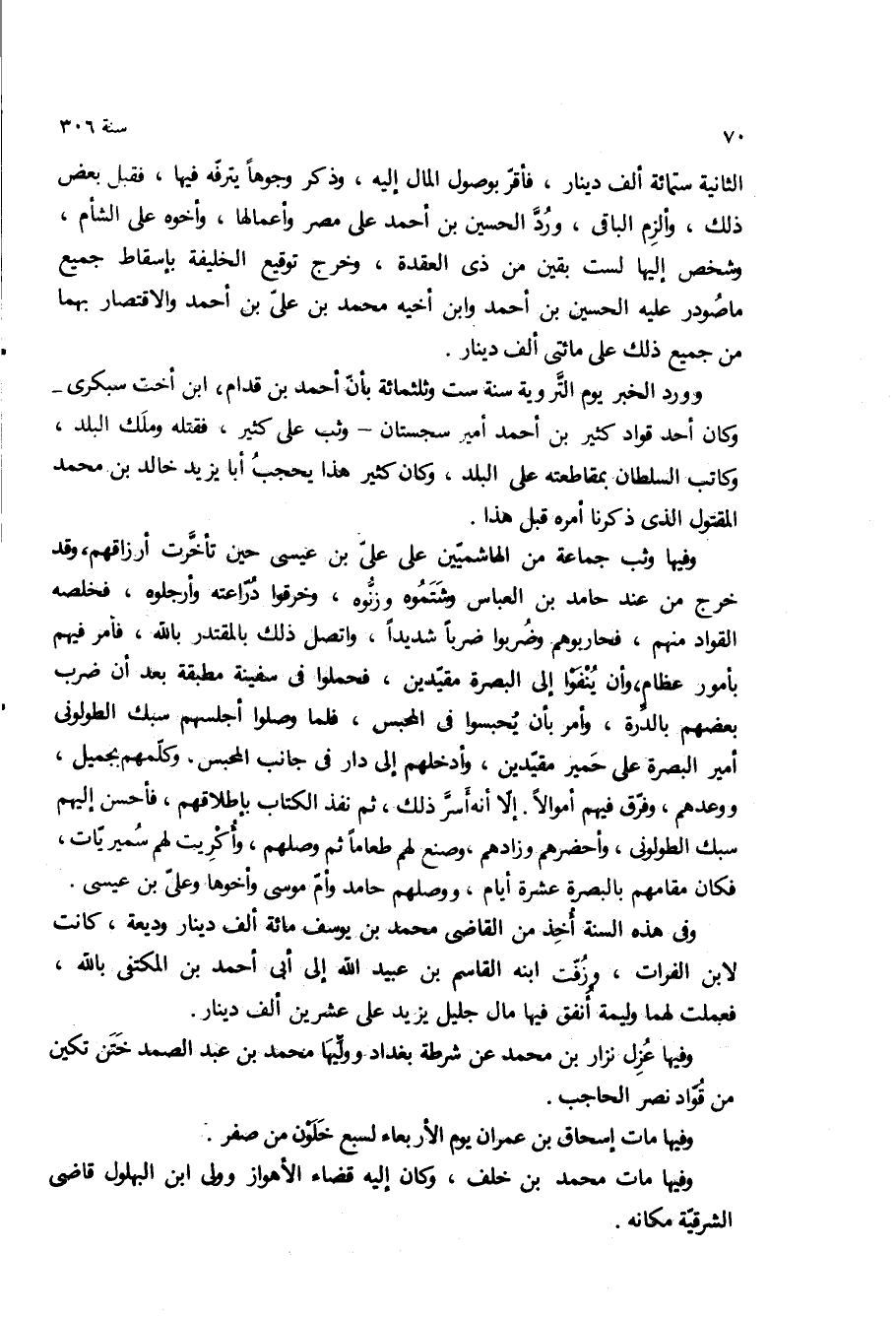 وفيها وثب جماعه من الهاشميين على على بن عيسى حين تاخرت أرزاقهم، وقد خرج من عند حامد بن العباس وشتموه وزنوه، وخرقوا دراعته وارجلوه، فخلصه القواد منهم، فحاربوهم وضربوا ضربا شديدا، واتصل ذلك بالمقتدر بالله، فامر فيهم بامور عظام، وان ينفوا الى البصره مقيدين، فحملوا في سفينه مطبقة بعد ان ضرب بعضهم بالدرة، وامر بان يحبسوا في المحبس، فلما وصلوا اجلسهم سبك الطولونى امير البصره على حمير مقيدين، وادخلهم الى دار في جانب المحبس، وكلمهم بجميل، ووعدهم، وفرق فيهم اموالا الا انه اسر ذلك، ثم نفذ الكتاب باطلاقهم، فاحسن اليهم سبك الطولونى، واحضرهم وزادهم، وصنع لهم طعاما ثم وصلهم، واكريت لهم سميريات، فكان مقامهم بالبصرة عشره ايام، ووصلهم حامد وأم موسى وأخوها وعلى بن عيسى.