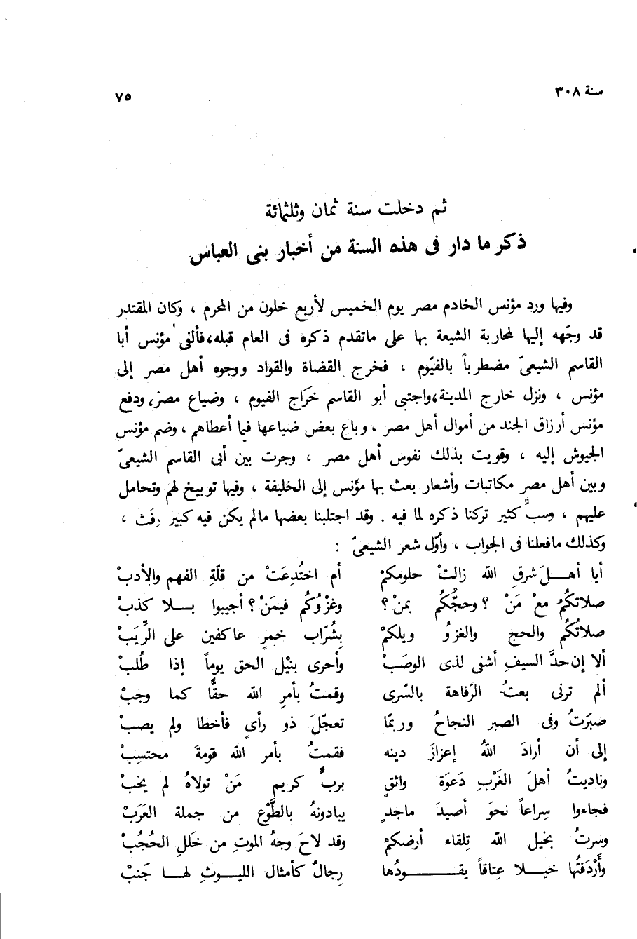 (ذكر ما دار في هذه السنه من اخبار بنى العباس) وفيها ورد مؤنس الخادم مصر يوم الخميس لاربع خلون من المحرم، وكان المقتدر قد وجهه إليها لمحاربه الشيعة بها على ما تقدم ذكره في العام قبله، فالفى مؤنس أبا القاسم الشيعى مضطربا بالفيوم، فخرج القضاه والقواد ووجوه اهل مصر الى مؤنس، ونزل خارج المدينة، واجتبى ابو القاسم خراج الفيوم، وضياع مصر، ودفع مؤنس ارزاق الجند من اموال اهل مصر، وباع بعض ضياعها فيما اعطاهم، وضم مؤنس الجيوش اليه، وقويت بذلك نفوس اهل مصر، وجرت بين ابى القاسم الشيعى وبين اهل مصر مكاتبات واشعار بعث بها مؤنس الى الخليفة، وفيها توبيخ لهم وتحامل عليهم، وسب كثير تركنا ذكره لما فيه وقد اجتلبنا بعضها ما لم يكن فيه كبير رفث، وكذلك ما فعلنا في الجواب، وأول شعر الشيعى: