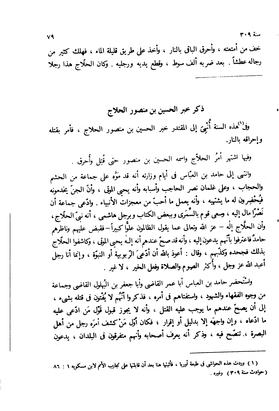 خف من امتعته، واحرق الباقى بالنار، وأخذ على طريق قليله الماء، فهلك كثير من رجاله عطشا بعد ضربه الف سوط، وقطع يديه ورجليه وكان الحلاج هذا رجلا