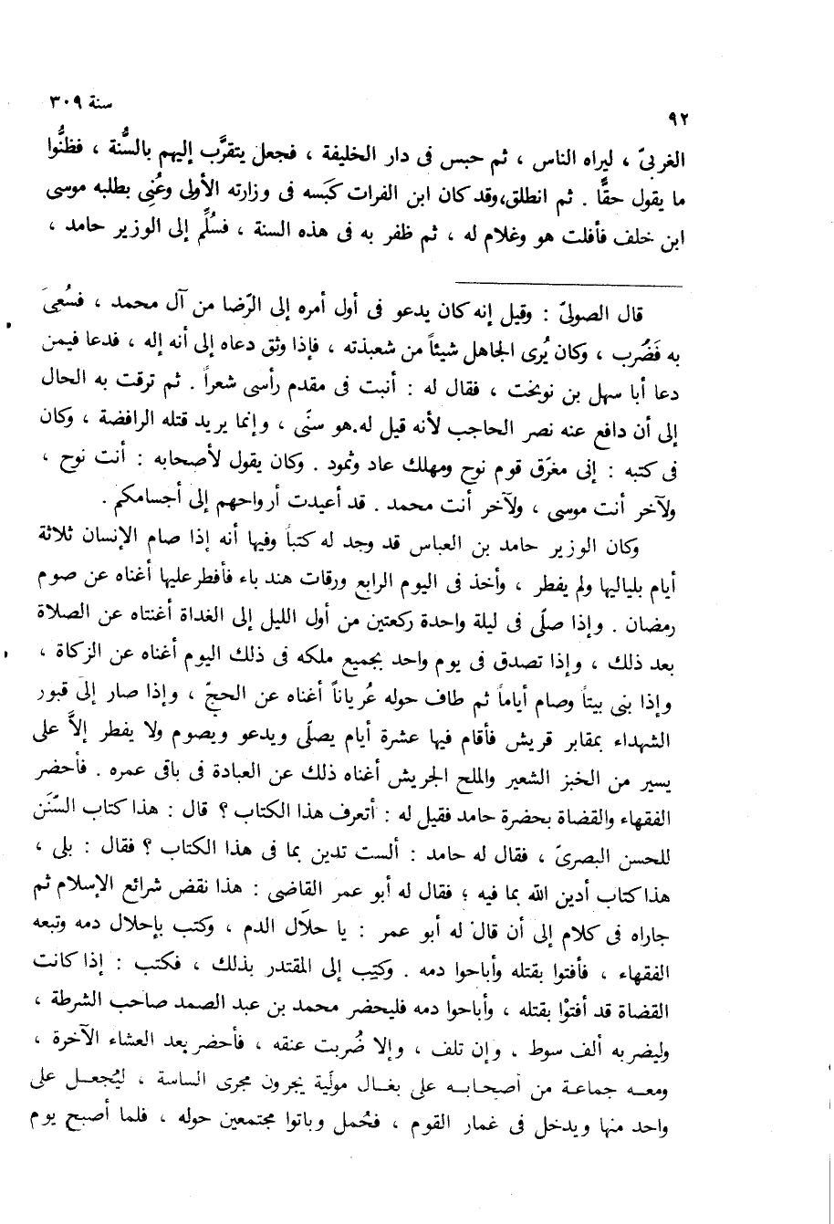 الغربي، ليراه الناس، ثم حبس في دار الخليفة، فجعل يتقرب اليهم بالسنه، فظنوا ما يقول حقا ثم انطلق، وقد كان ابن الفرات كبسه في وزارته الاولى وعنى بطلبه موسى ابن خلف فافلت هو وغلام له، ثم ظفر به في هذه السنه، فسلم الى الوزير حامد،