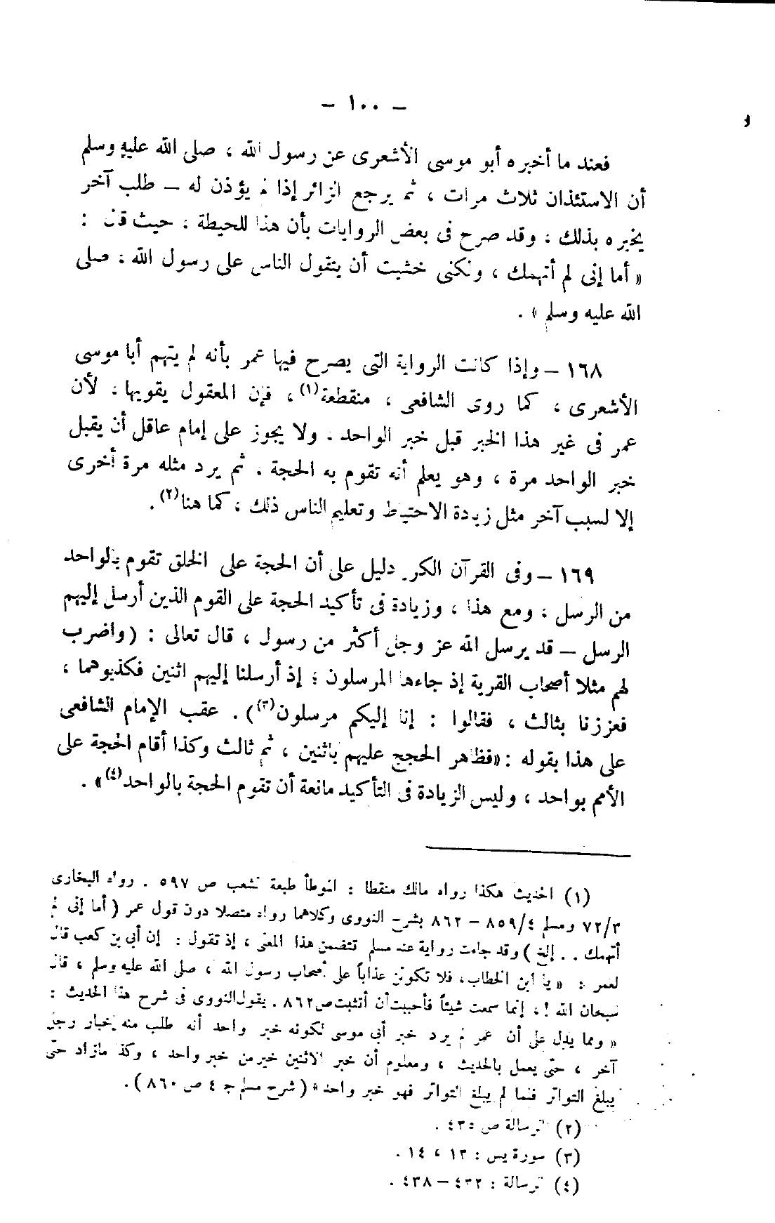 169- وفي القرآن الكريم دليل على أن الحجة على الخلق تقوم بالواحد من الرسل، ومع هذا، وزيادة في تأكيد الحجة على القوم الذين أرسل إليهم الرسل -قد يرسل الله عز وجل أكثر من رسول، قال تعالى: {وَاضْرِبْ لَهُمْ مَثَلًا أَصْحَابَ الْقَرْيَةِ إِذْ جَاءَهَا الْمُرْسَلُونَ، إِذْ أَرْسَلْنَا إِلَيْهِمُ اثْنَيْنِ فَكَذَّبُوهُمَا فَعَزَّزْنَا بِثَالِثٍ فَقَالُوا إِنَّا إِلَيْكُمْ مُرْسَلُونَ} 3. عقب الإمام فكذبوهما، فعززنا بثالث، فقالوا: إنا إليكم مرسلون3". عقب الإمام الشافعي على هذا بقوله: "فظاهر الحجج عليهم باثنين، ثم ثالث وكذا أقام الحجة على الأمم بواحد، وليس الزيادة في التأكيد مانعة أن تقوم الحجة بالواحد4".