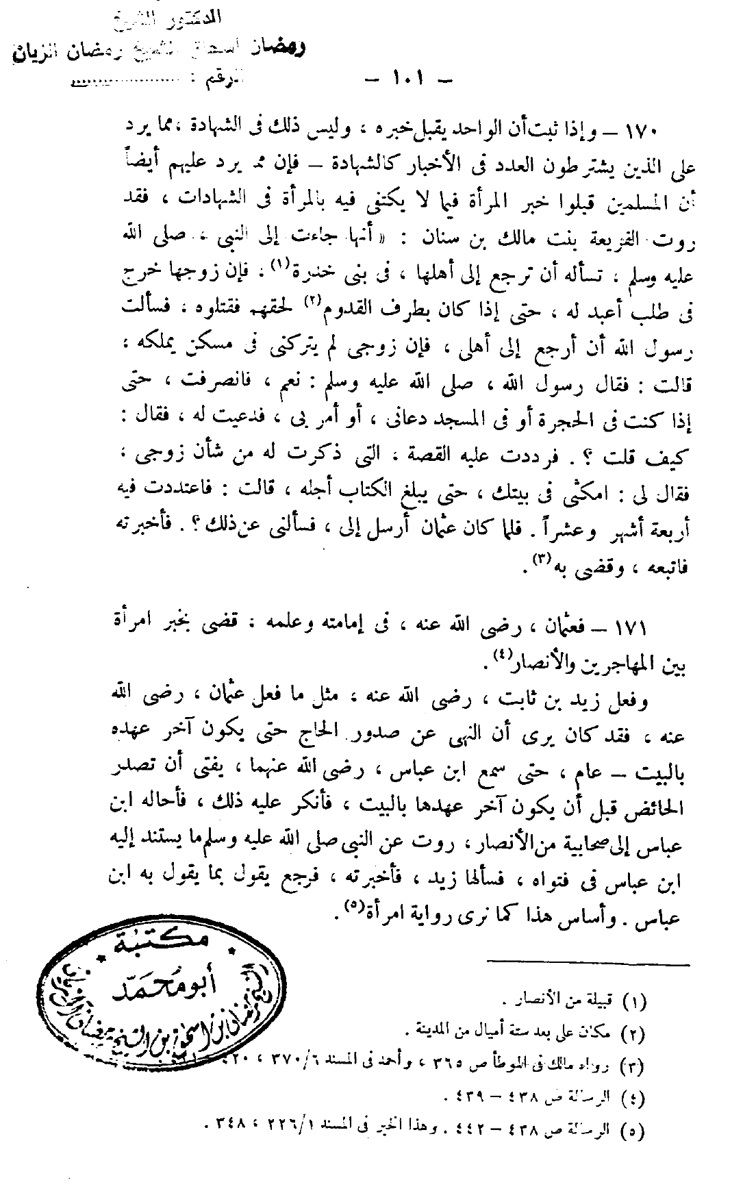 171- فعثمان رضي الله عنه في إمامته وعلمه، قضى بخبر امرأة بين المهاجرين والأنصار4.