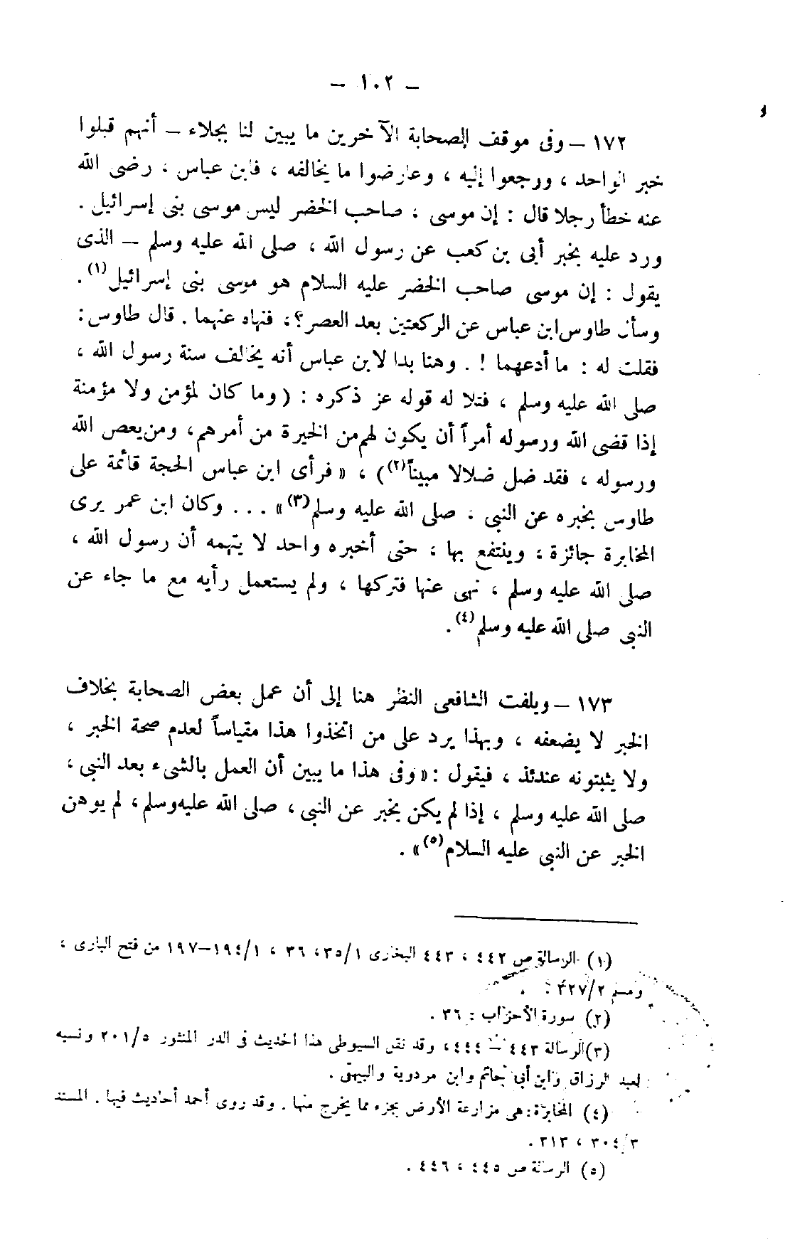 172- وفي موقف الصحابة الآخرين ما يبين لنا بجلاء -أنهم قبلوا خبر الواحد، ورجعوا إليه، وعارضوا ما يخالفه، فابن عباس، رضي الله عنه خطأ رجلًا قال: إن موسى، صاحب الخضر ليس موسى بني إسرائيل. ورد عليه بخبر أبي بن كعب عن رسول الله، صلى الله عليه وسلم، الذي يقول: إن موسى صاحب الخضر عليه السلام هو موسى بني إسرائيل1. وسأل طاوس ابن عباس عن الركعتين بعد العصر؟ فنهاه عنهما. قال طاوس: فقلت له: ما أدعهما!. وهنا بدا لابن عباس أنه يخالف سنة رسول الله، صلى الله عليه وسلم، فتلا له قوله عز ذكره: {وَمَا كَانَ لِمُؤْمِنٍ وَلا مُؤْمِنَةٍ إِذَا قَضَى اللَّهُ وَرَسُولُهُ أَمْرًا أَنْ يَكُونَ لَهُمُ الْخِيَرَةُ مِنْ أَمْرِهِمْ وَمَنْ يَعْصِ اللَّهَ وَرَسُولَهُ فَقَدْ ضَلَّ ضَلالا مُبِينًا} 2. "فرأى ابن عباس الحجة قائمة على طاوس بخبره عن النبي، صلى الله عليه وسلم3" ... وكان ابن عمر يرى المخابرة جائزة، وينتفع بها، حتى أخبره واحد لا يتهمه أن رسول الله، صلى الله عليه وسلم، نهى عنها فتركها، ولم يستعمل رأيه مع ما جاء عن النبي صلى الله عليه وسلم4.
