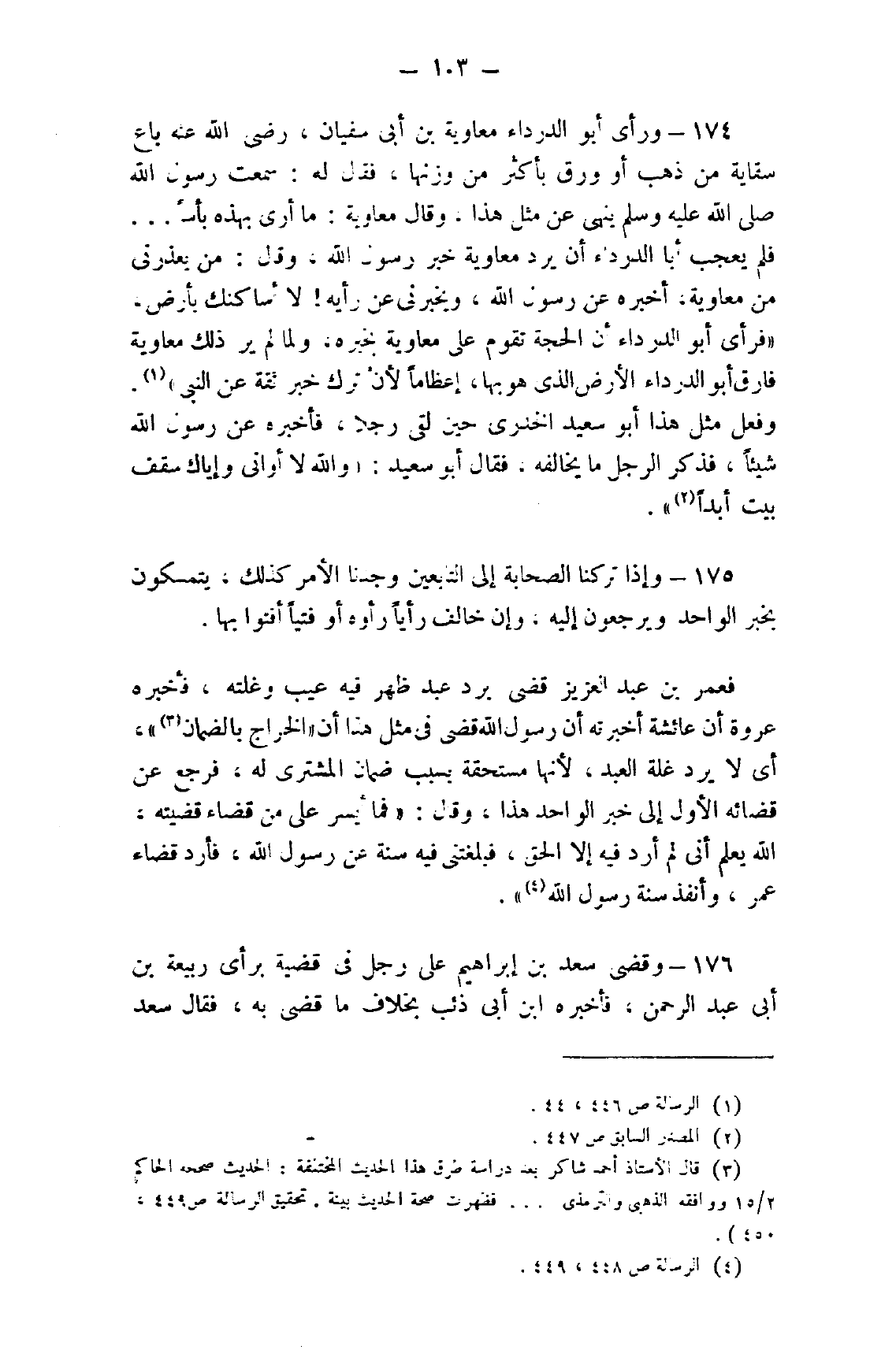 174- ورأى أبو الدرداء معاوية بن أبي سفيان، رضي الله عنه باع سقاية من ذهب أو ورق بأكثر من وزنها، فقال له: سمعت رسول الله صلى الله عليه وسلم ينهى عن مثل هذا، وقال معاوية: ما أرى بهذه بأسًا ... فلم يعجب أبا الدرداء أن يرد معاوية خبر رسول الله، وقال: من يعذرني من معاوية، أخبره عن رسول الله، ويخبرني عن رأيه! لا أساكنك بأرض، "فرأى أبو الدرداء أن الحجة تقوم على معاوية بخبره، ولما لم ير ذلك معاوية فارق أبو الدرداء الأرض الذي هو بها، إعظامًا لأن ترك خبر ثقة عن النبي"1.