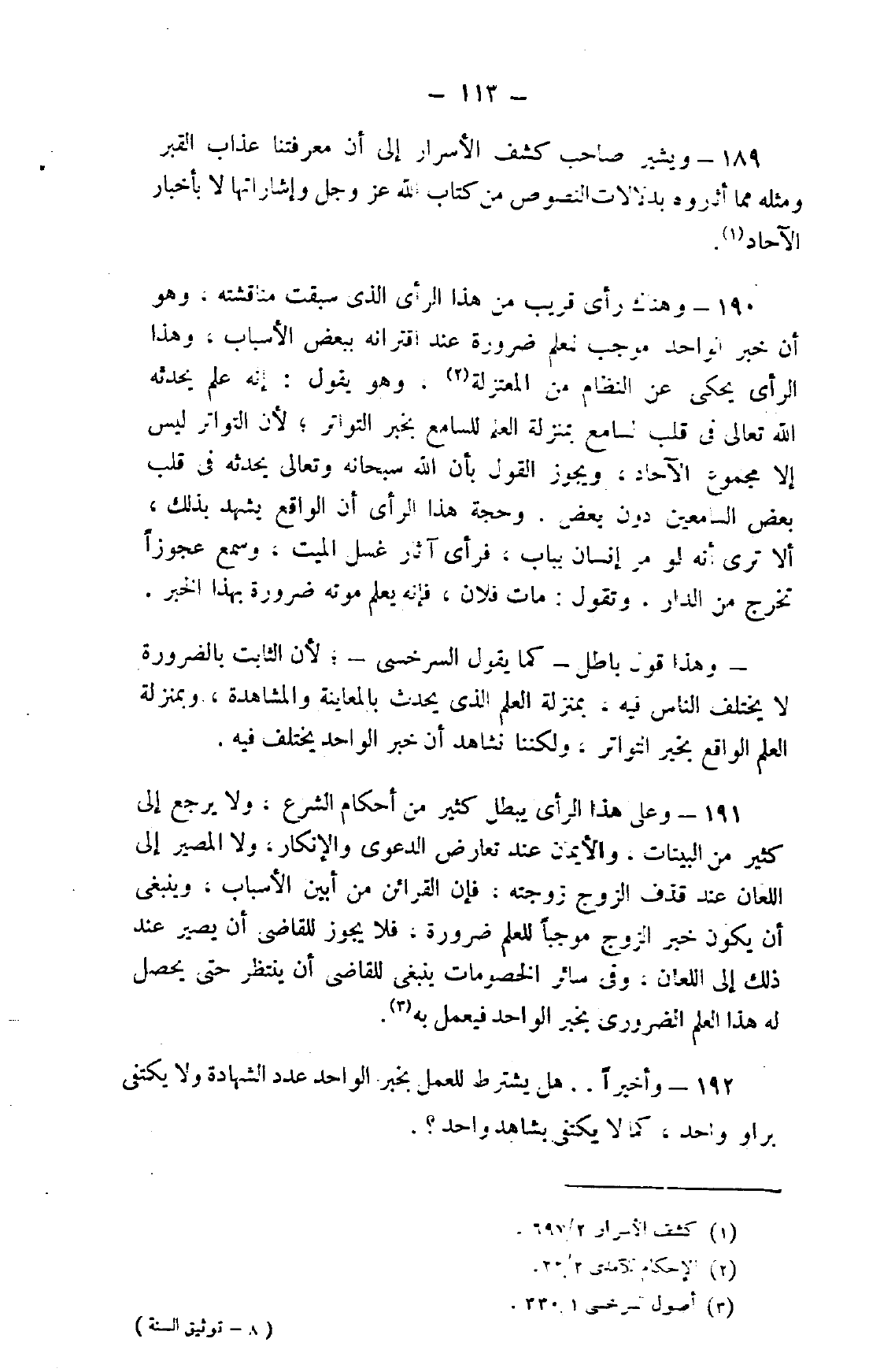 189- ويشير صاحب "كشف الأسرار" إلى أن معرفتنا عذاب القبر ومثله مما أثاروه بدلالات النصوص من كتاب الله عز وجل وإشاراتها لا بأخبار الآحاد1.