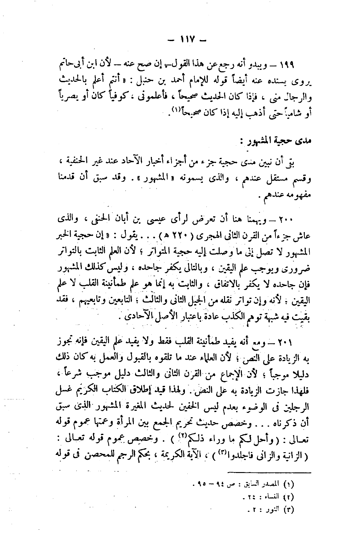 200- ويهمنا هنا أن نعرض لرأي عيسى بن أبان الحنفي، والذي عاش جزءًا من القرن الثاني الهجري "220هـ" ... يقول: "إن حجية الخبر المشهور لا تصل إلى ما وصلت إليه حجية المتواتر، لأن العلم الثابت بالتواتر ضروري ويوجب علم اليقين، وبالتالي يكفر جاحده، وليس كذلك المشهور فإن جاحده لا يكفر بالاتفاق، والثابت به إنما هو علم طمأنينة القلب لا علم اليقين؛ لأنه وإن تواتر نقله من الجيل الثاني والثالث؛ التابعين وتابعيهم، فقد بقيت فيه شبهة توهم الكذب عادة باعتبار الأصل الآحادي.