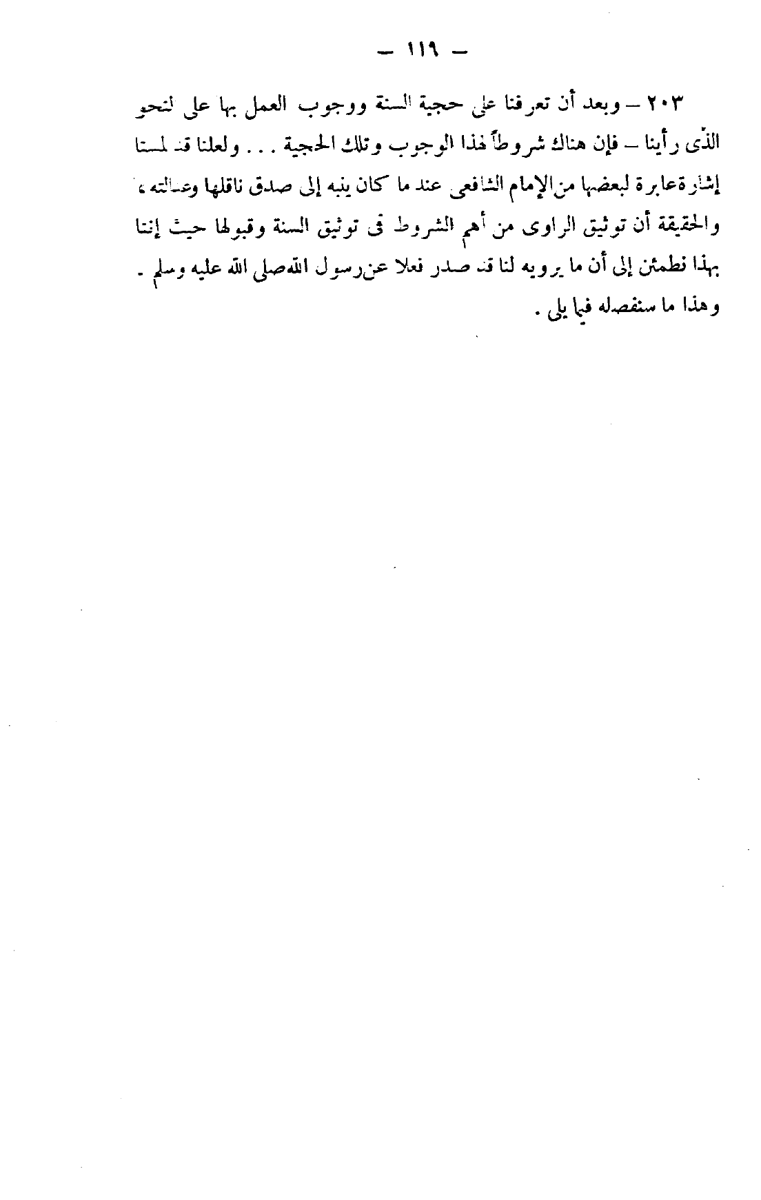 203- وبعد أن تعرفنا على حجية السنة ووجوب العمل بها على النحو الذي رأيناه -فإن هناك شروطًا لهذا الوجوب وتلك الحجية ... ولعلنا قد لمسنا إشارة عابرة لبعضها من الإمام الشافعي عندما كان ينبه إلى صدق ناقلها وعدالته، والحقيقة أن توثيق الراوي من أهم الشروط في توثيق السنة وقبولها حيث إننا بهذا نطمئن إلى أن ما يرويه لنا قد صدر فعلًا عن رسول الله صلى الله عليه وسلم.