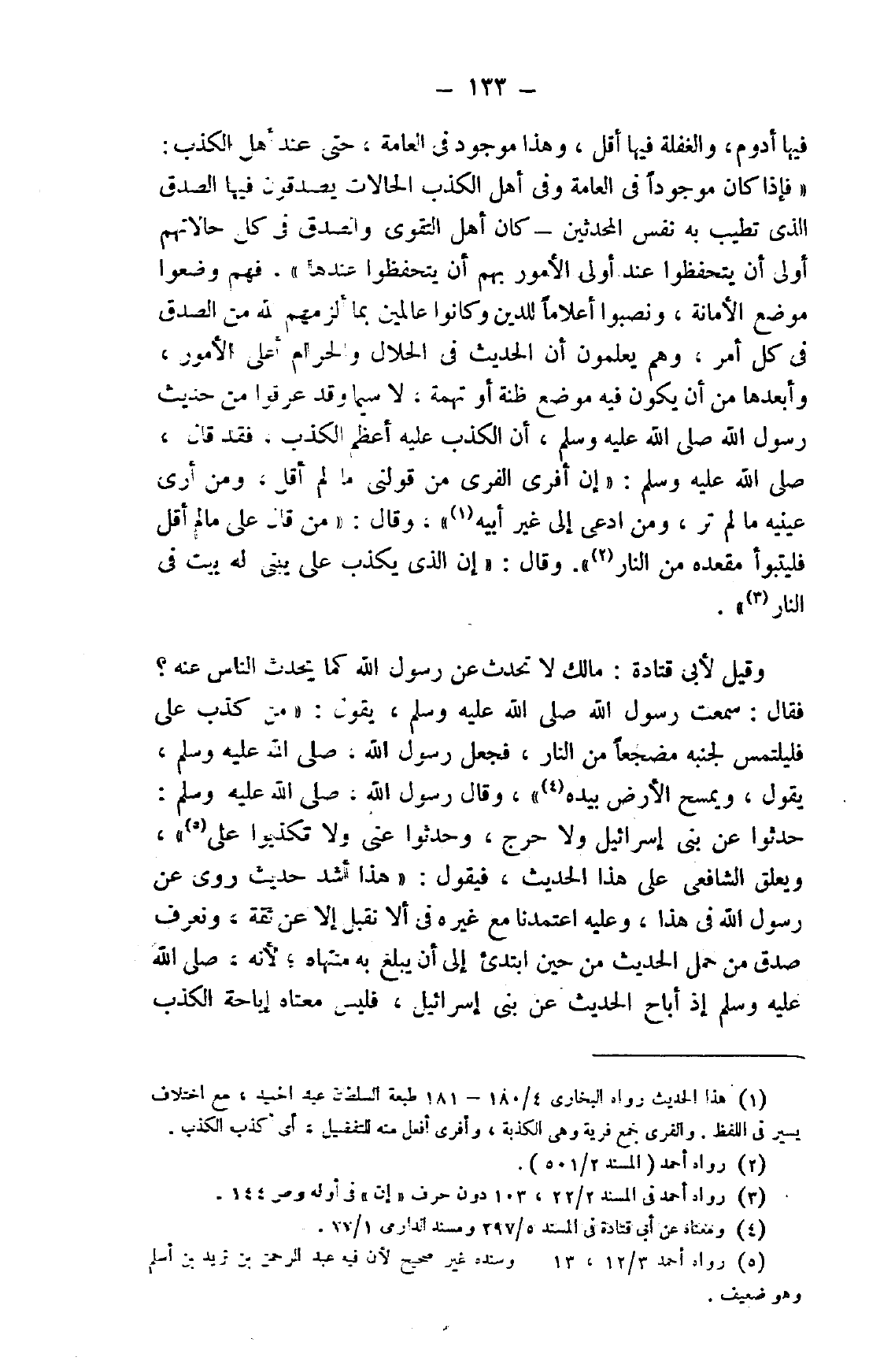 وقيل لأبي قتادة: ما لك لا تحدث عن رسول الله كما يحدث الناس عنه؟ فقال: سمعت رسول الله صلى الله عليه وسلم، يقول: "من كذب علي فليلتمس لجنبه مضجعًا من النار"، فجعل رسول الله، صلى الله عليه وسلم، يقول، "ويمسح الأرض بيده" 4، وقال رسول الله، صلى الله عليه وسلم: "حدثوا عن بني إسرائيل ولا حرج، وحدثوا عني ولا تكذبوا علي" 5، ويعلق الشافعي على هذا الحديث، فيقول: هذا أشد حديث روي عن رسول الله في هذا، وعليه اعتمدنا مع غيره في ألا نقبل إلا عن ثقة، ونعرف صدق من حمل الحديث من حين ابتدئ إلى أن يبلغ به منتهاه؛ لأنه، صلى الله عليه وسلم إذ أباح الحديث عن بني إسرائيل، فليس معناه إباحة الكذب
